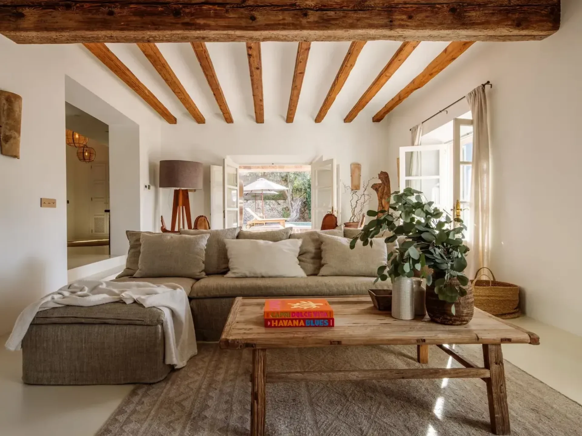 Blending traditional architecture with modern sophistication, Sa Llupia features stone façades, terracotta roofs, and soft green shutters, all complemented by light-filled interiors. The décor combines earthy tones, bespoke furniture, and curated Spanish art, creating an atmosphere of refined warmth. The living room, with its vaulted beamed ceiling, and the modern kitchen equipped with top-of-the-line Miele appliances, reflect understated luxury. A covered terrace with a Weber barbecue provides the perfect setting for al fresco dining.