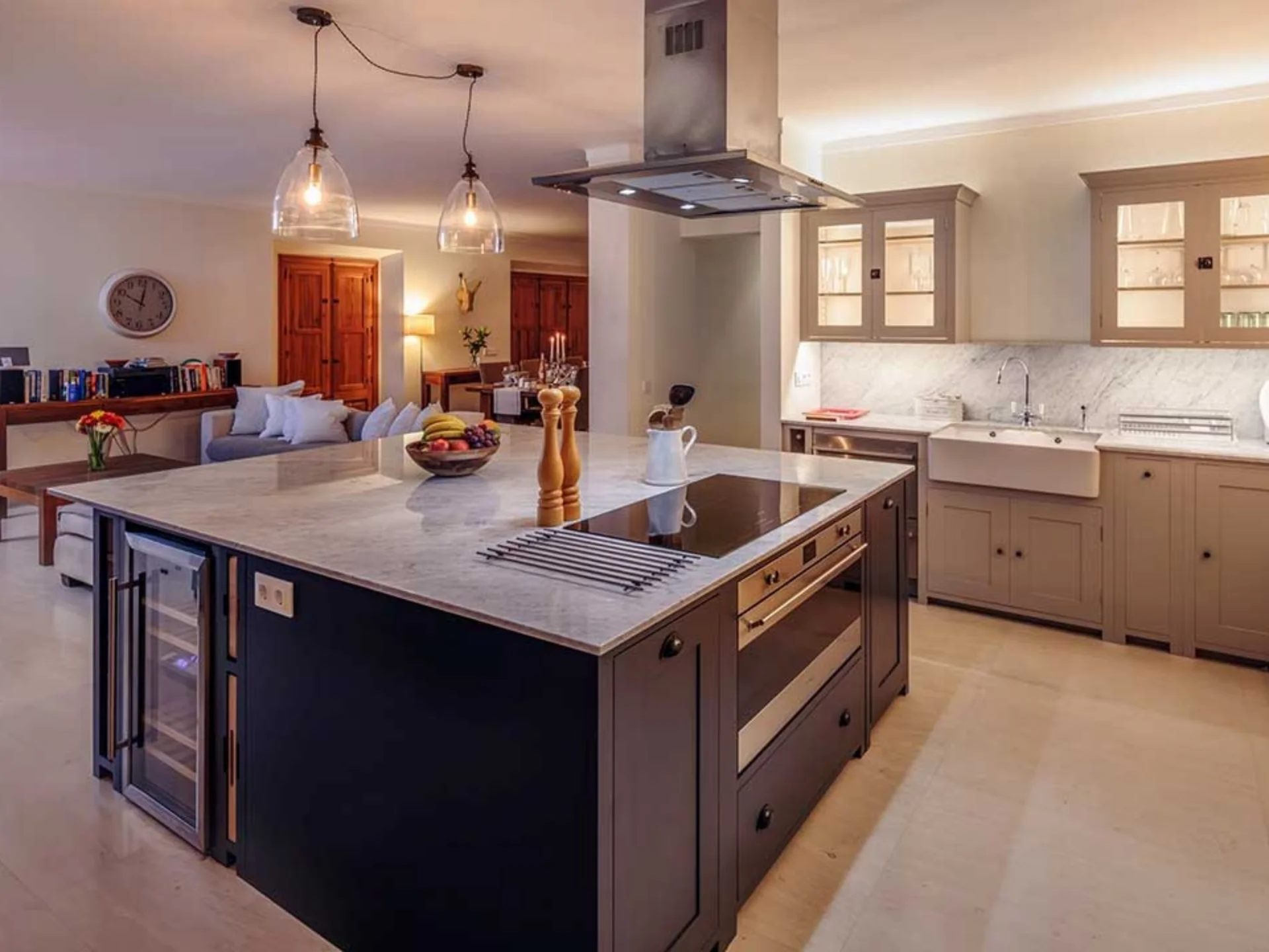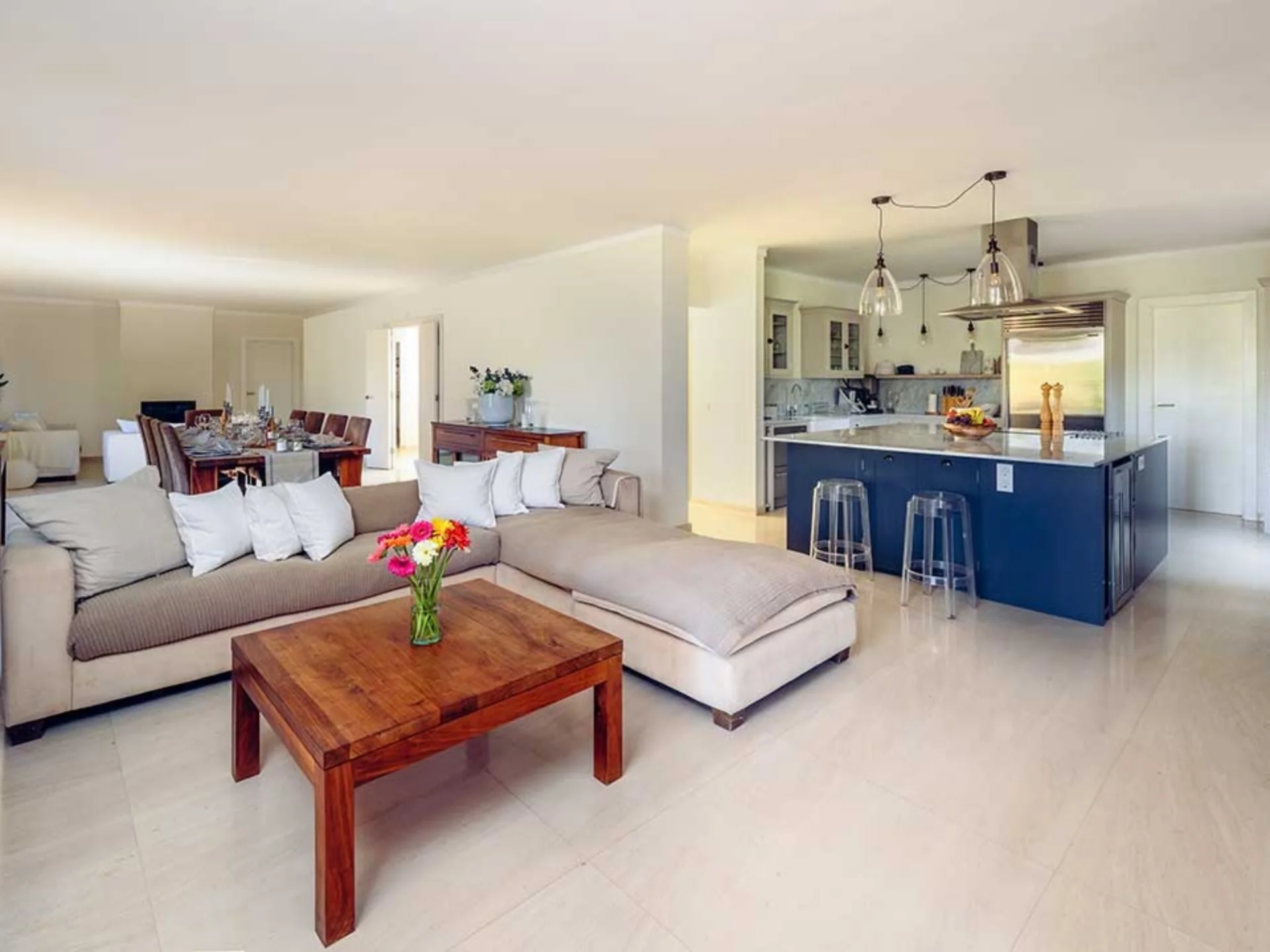 Inside, the villa offers over 4,500 ft² of living space, beginning with a striking double-height entrance hall that sets the tone for the home’s sense of openness. The 50-foot lounge flows seamlessly into a sleek, fully equipped kitchen, ideal for effortless entertaining. All rooms benefit from air conditioning and underfloor heating, while open fireplaces add character during the cooler months.