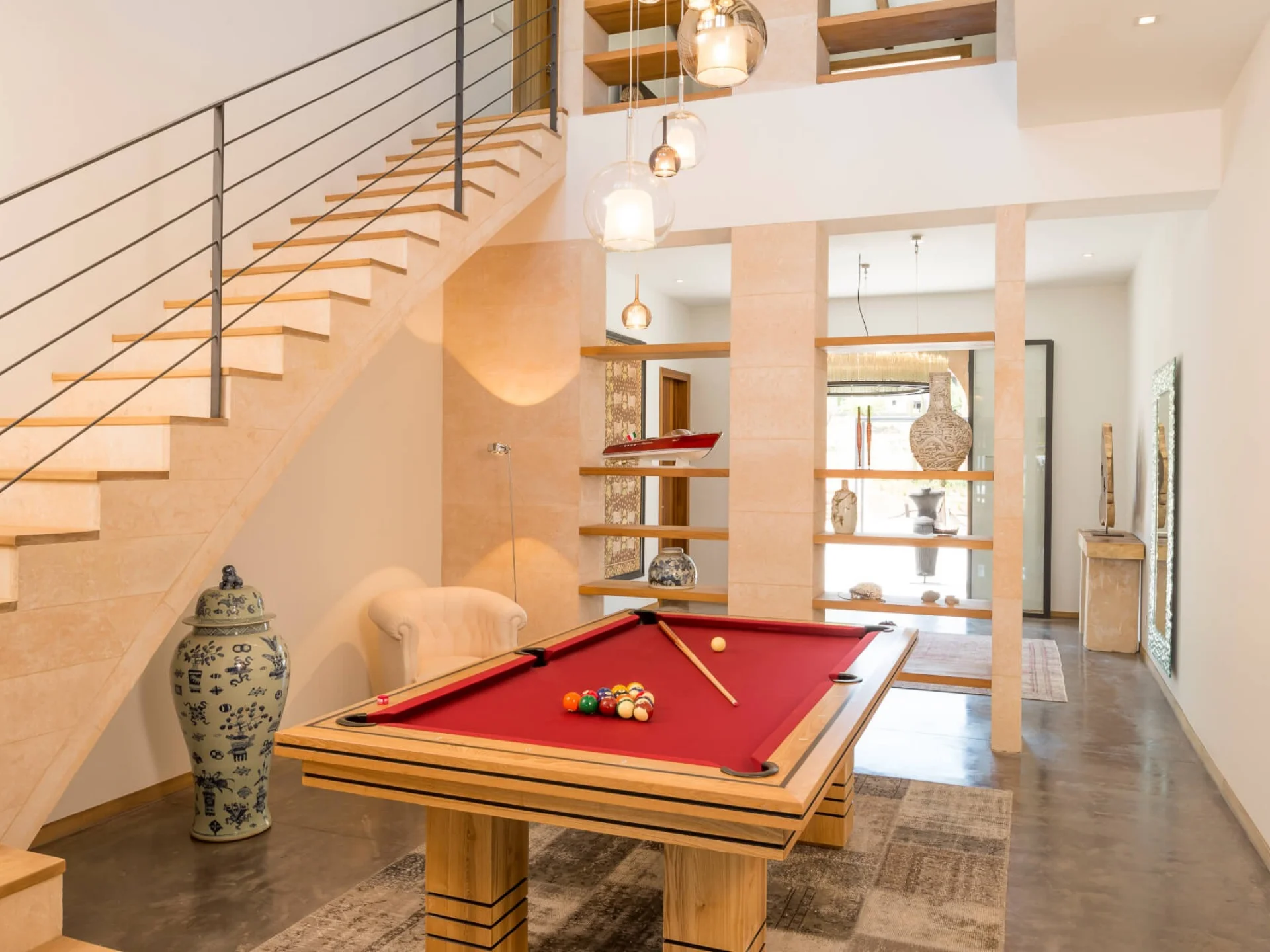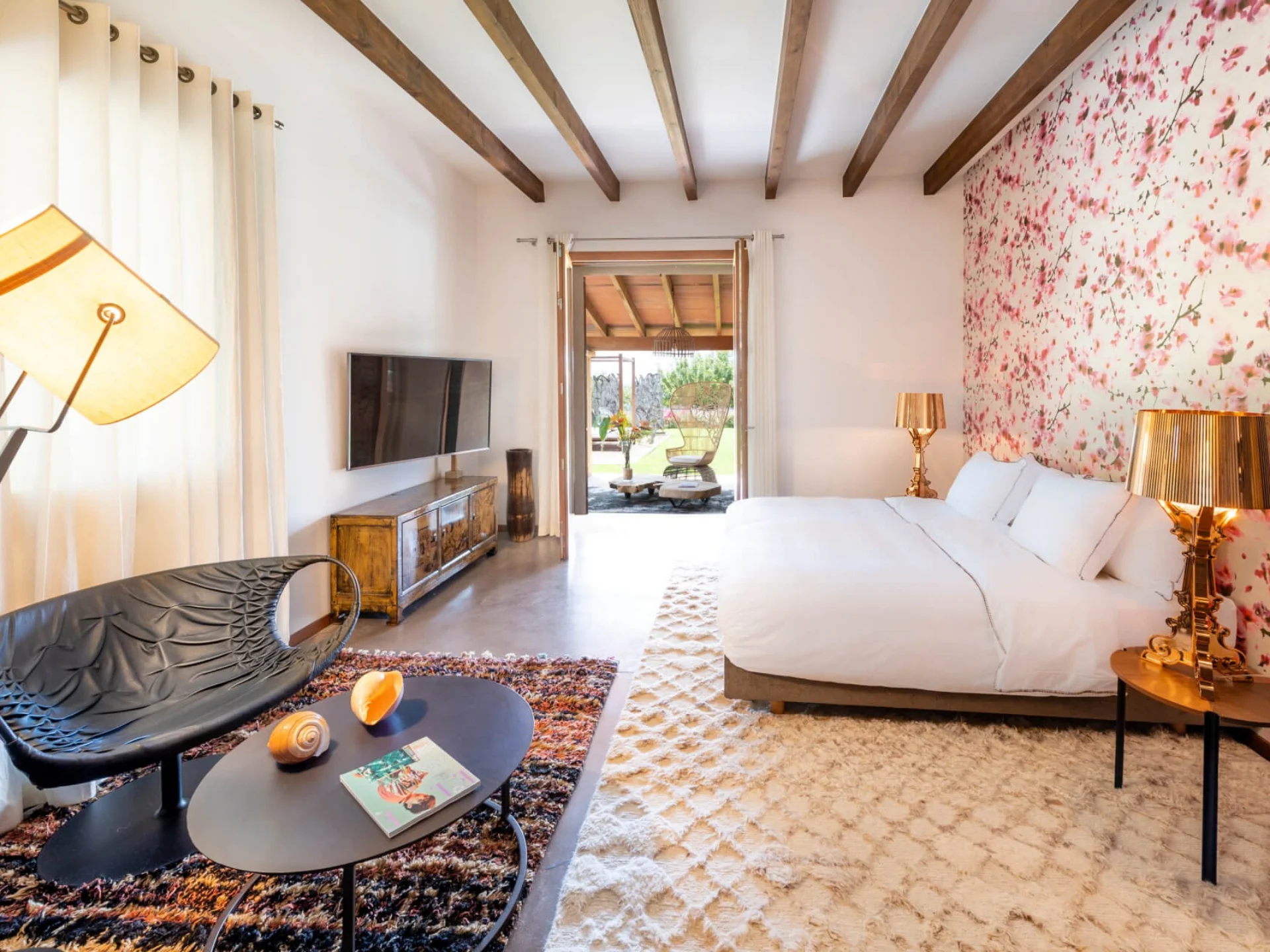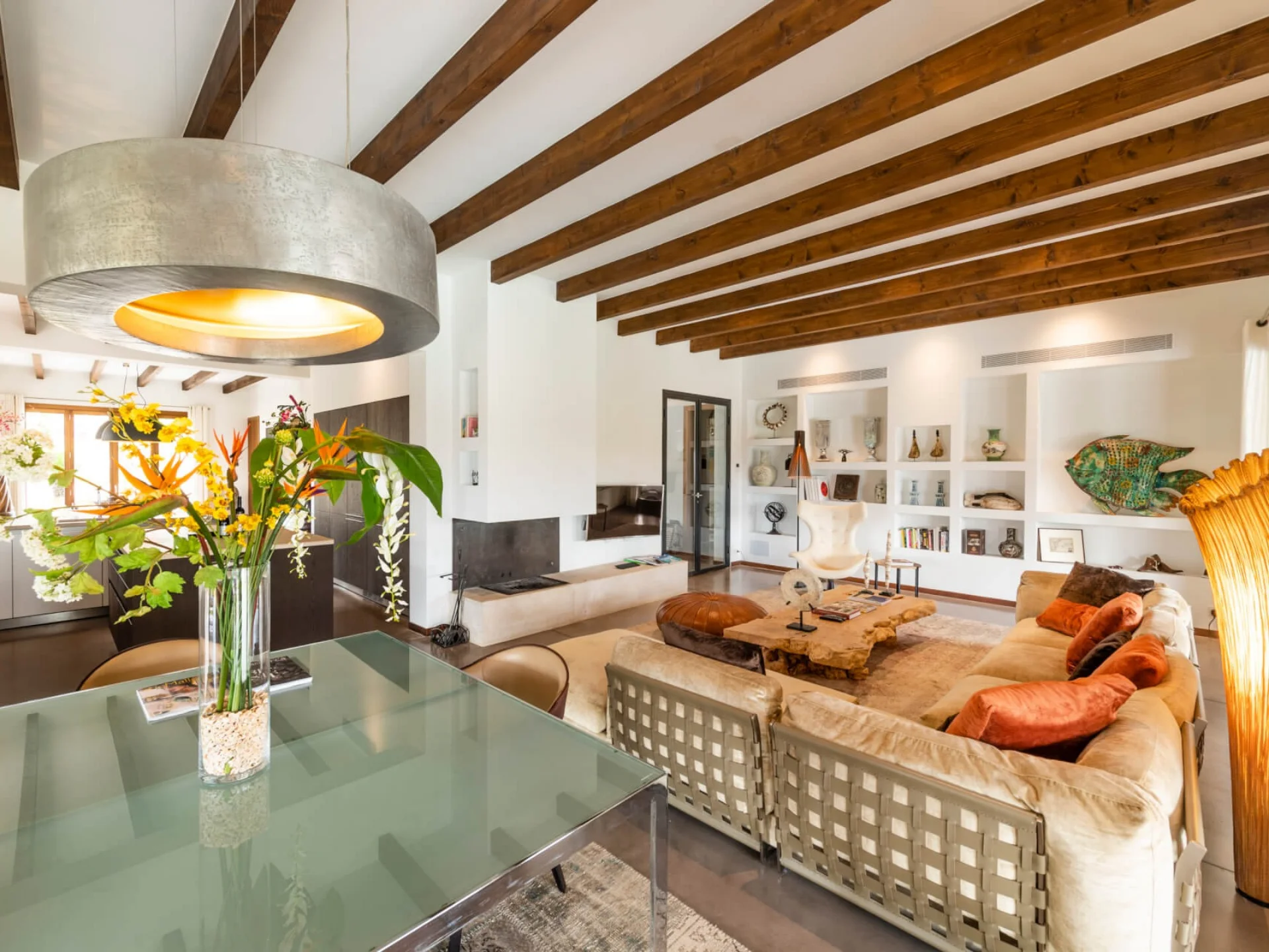 The architecture reflects traditional Mallorcan finca design, enhanced by contemporary comforts and carefully curated interiors. Inside, generous open-plan living and dining areas create a relaxed yet elegant atmosphere, ideal for shared living and entertaining. Natural materials, exposed beams and large windows allow light to flow throughout the home while maintaining a calm, understated aesthetic.
