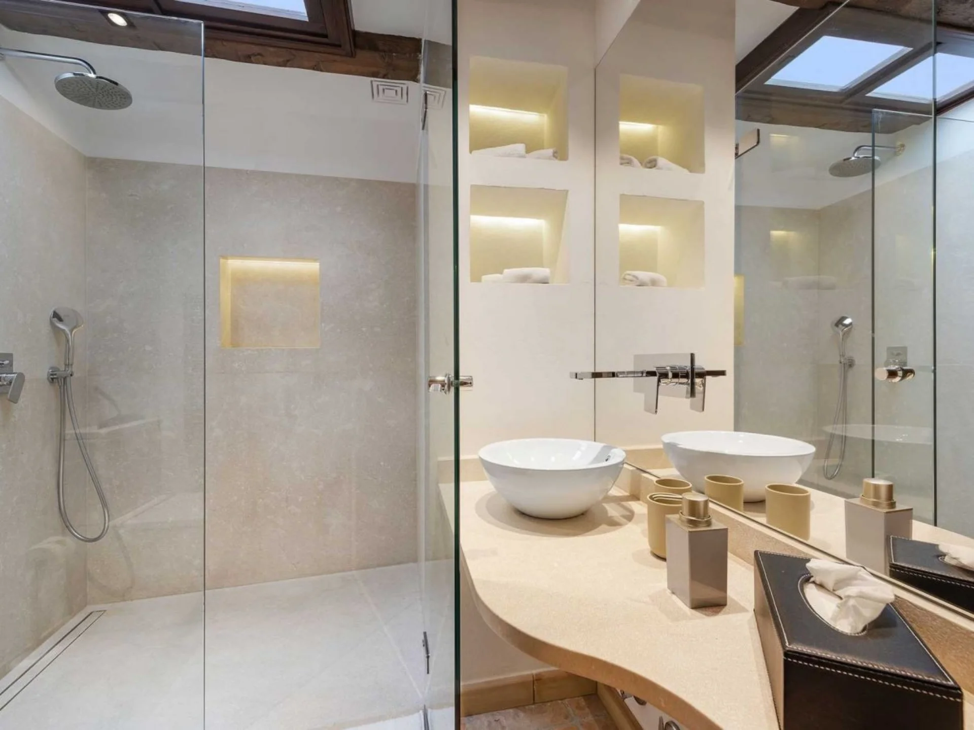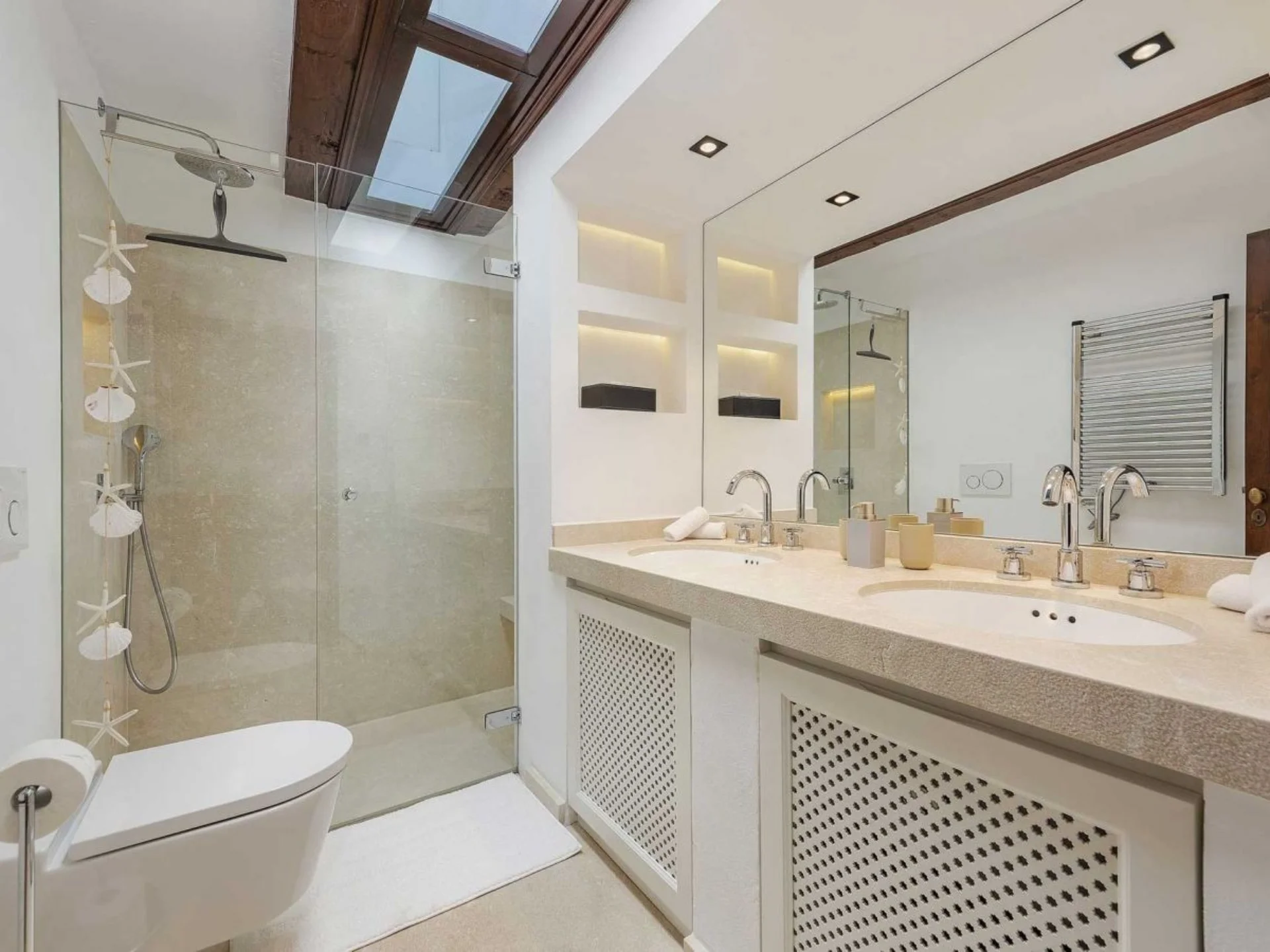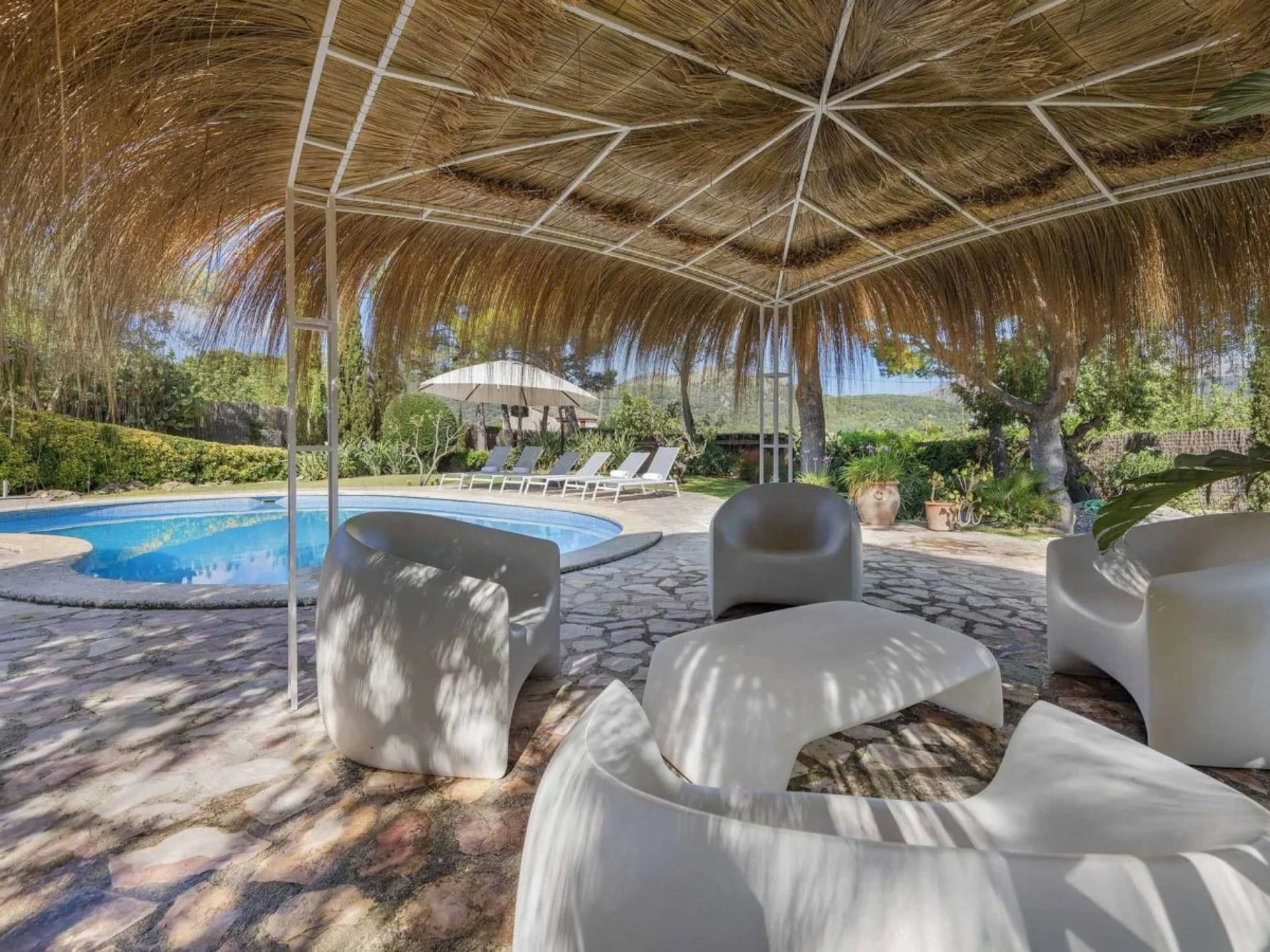 The outdoor spaces are designed for relaxed Mediterranean living. A private swimming pool sits at the heart of the villa’s grounds, surrounded by sunbathing areas and generous terraces where guests can unwind and enjoy the serene surroundings. Covered outdoor dining areas and shaded seating spaces provide the perfect setting for long, leisurely meals and evenings spent outdoors.