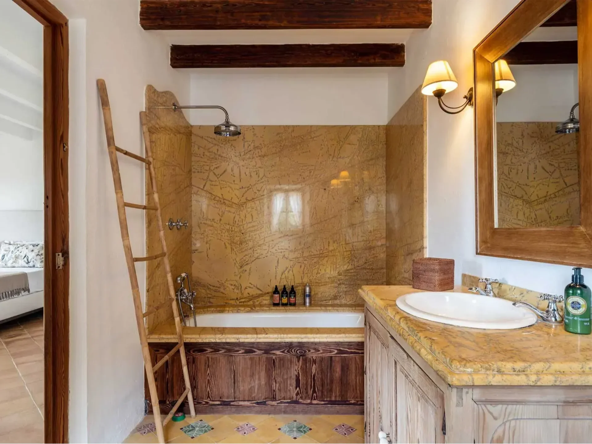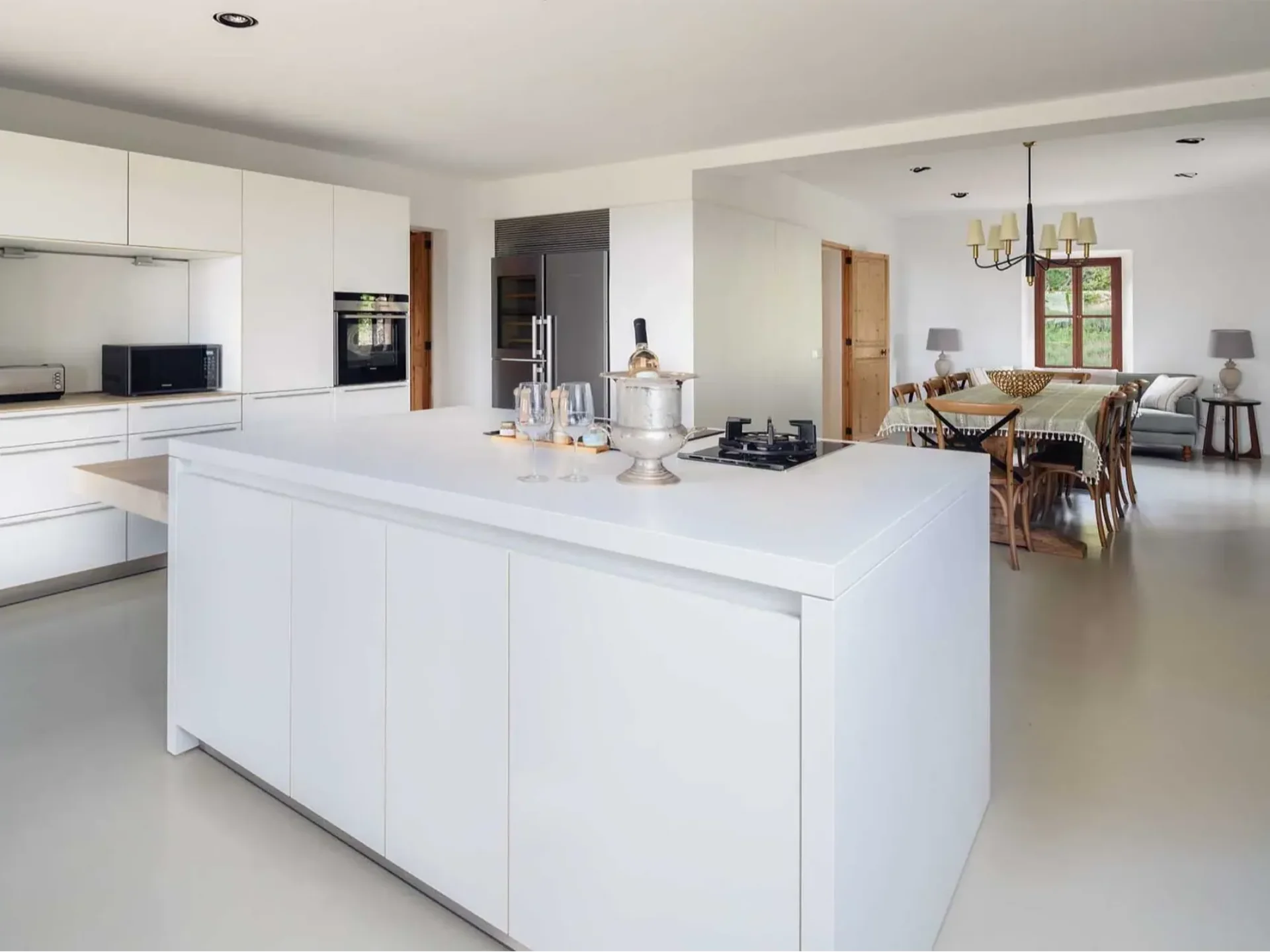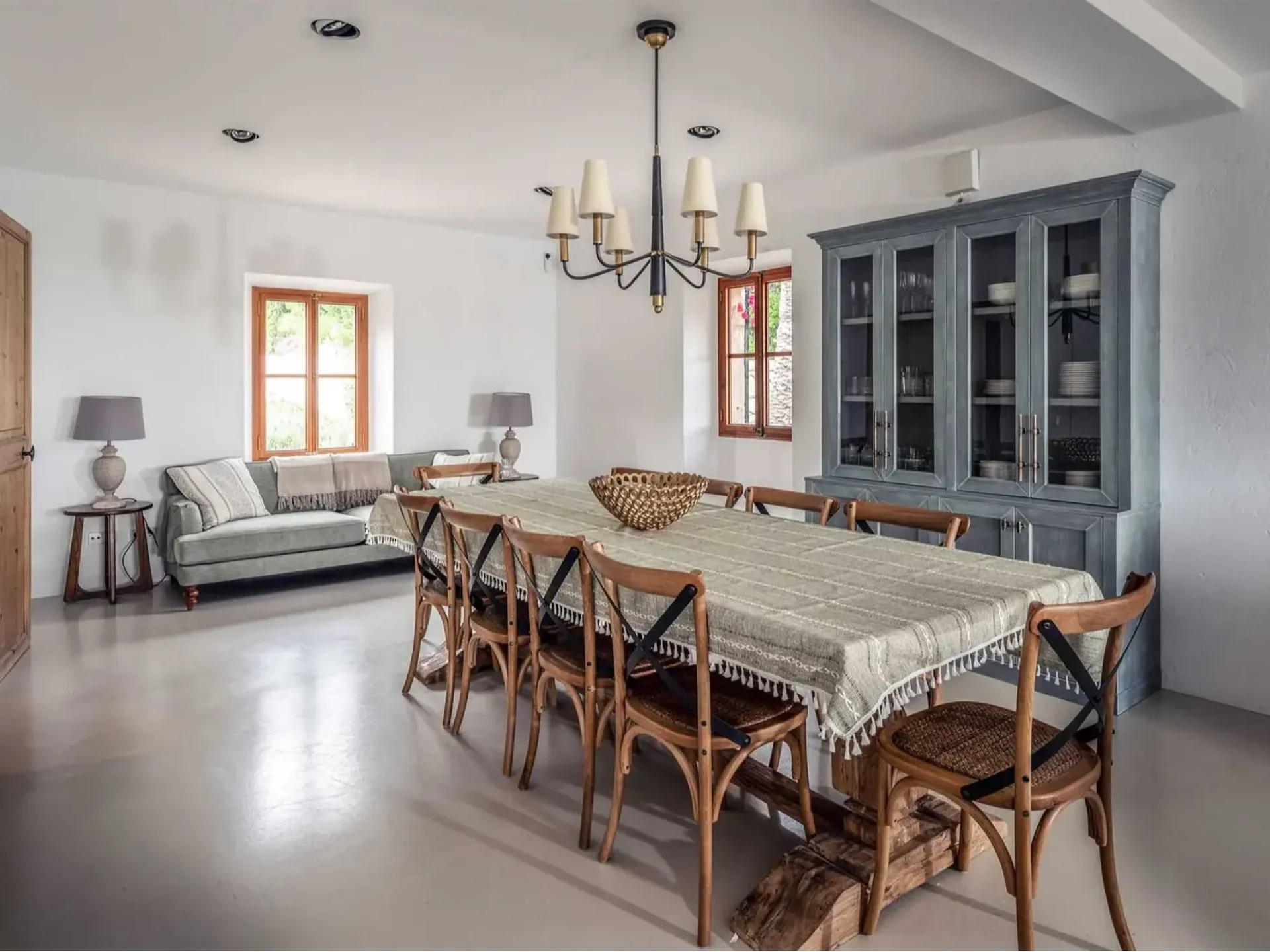 Set within a traditional stone-built property, the villa harmonizes with its natural surroundings, featuring white-washed walls, elegant décor, and wooden touches throughout. It accommodates up to 10 adults with an additional two children, spread across six generously sized bedrooms, most with ensuite bathrooms, including a master suite with a grand fireplace and seating area.