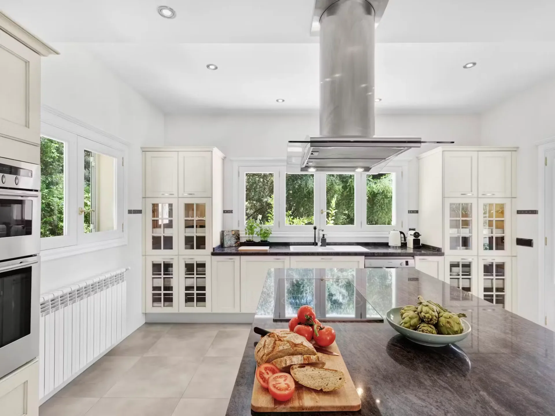 The villa sleeps 8 guests, with an additional sofa bed for two children, and includes a nursery for families with babies. The fully equipped kitchen offers a breakfast island and a large dining table, while outdoor dining for 10 complements the 20 m swimming pool, lush gardens, and ample spaces for relaxation and exercise.