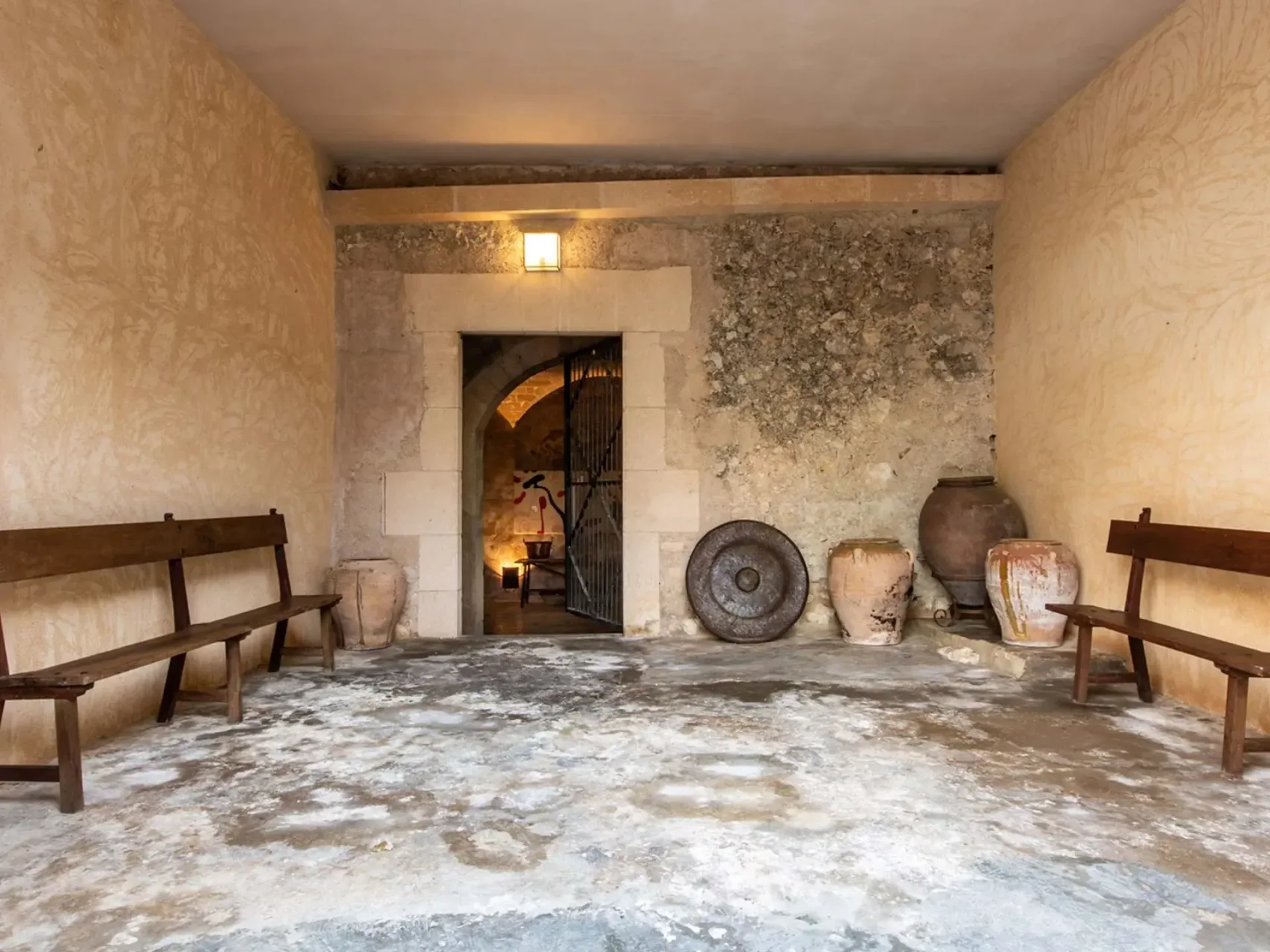 The interiors unfold across approximately 350 m² of living space, where classic elements such as terracotta tile floors, antique furnishings and thick stone walls are complemented by a fresh, updated finish. Spacious communal areas create a warm and inviting atmosphere, including a generous lounge with a log fireplace that provides a cosy setting during cooler evenings.