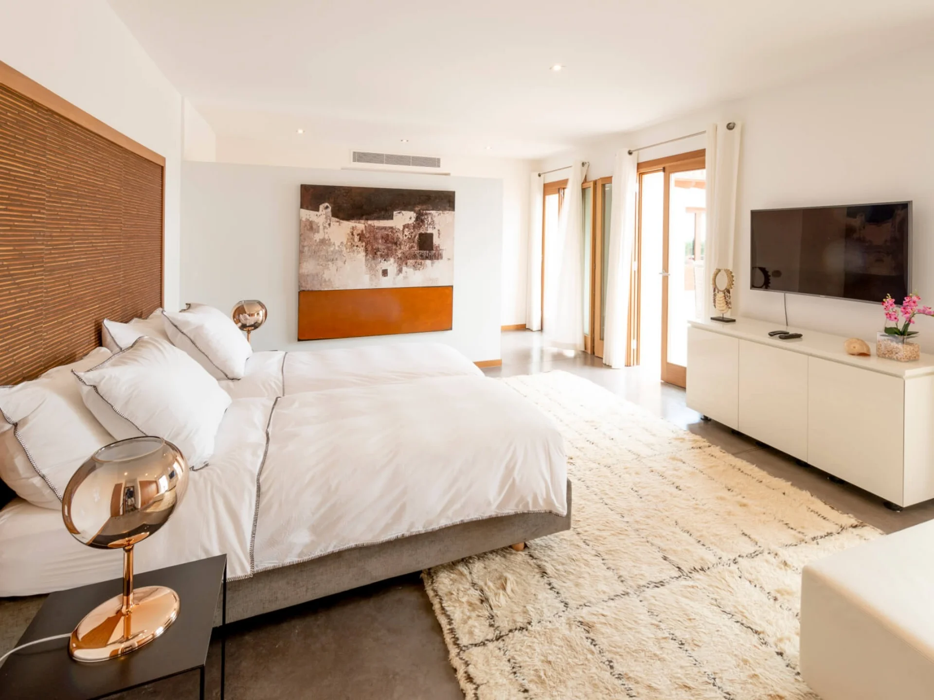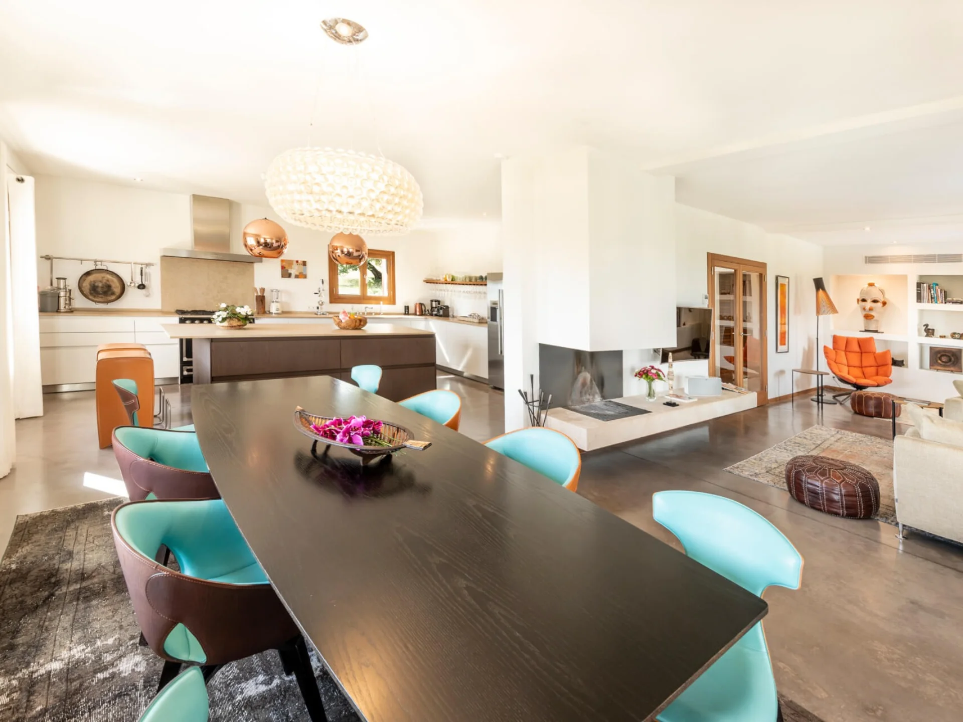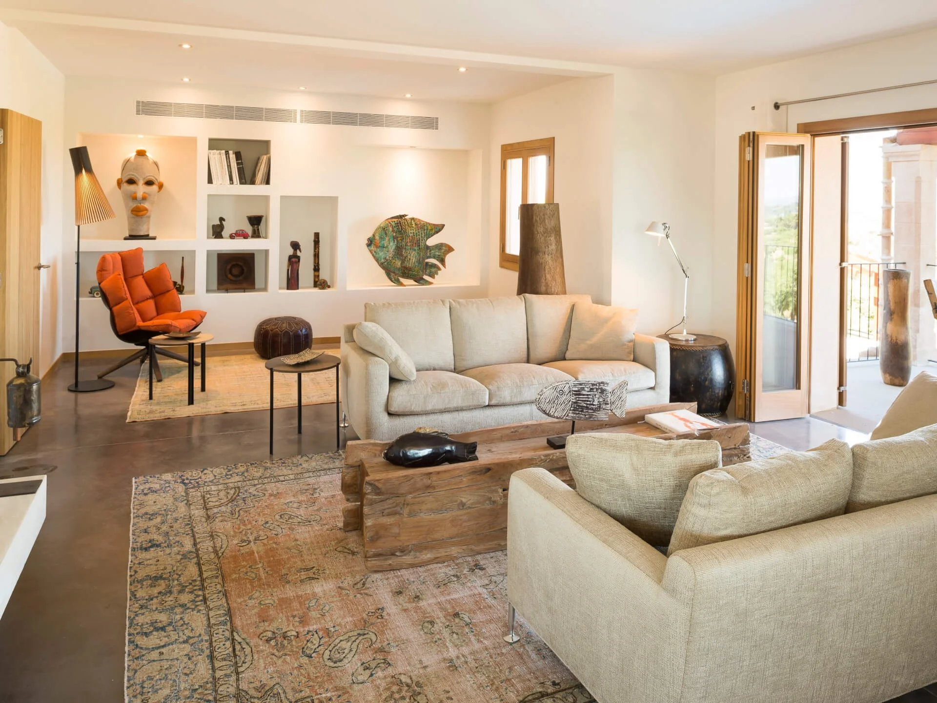 The villa blends traditional Mallorcan architecture with high-end contemporary design, creating a warm yet sophisticated atmosphere throughout. Generous interiors include multiple living areas, designed for both relaxation and entertainment, alongside a fully equipped designer kitchen ideal for shared meals and gatherings. Natural materials, carefully selected furnishings and thoughtful lighting enhance the sense of understated luxury.