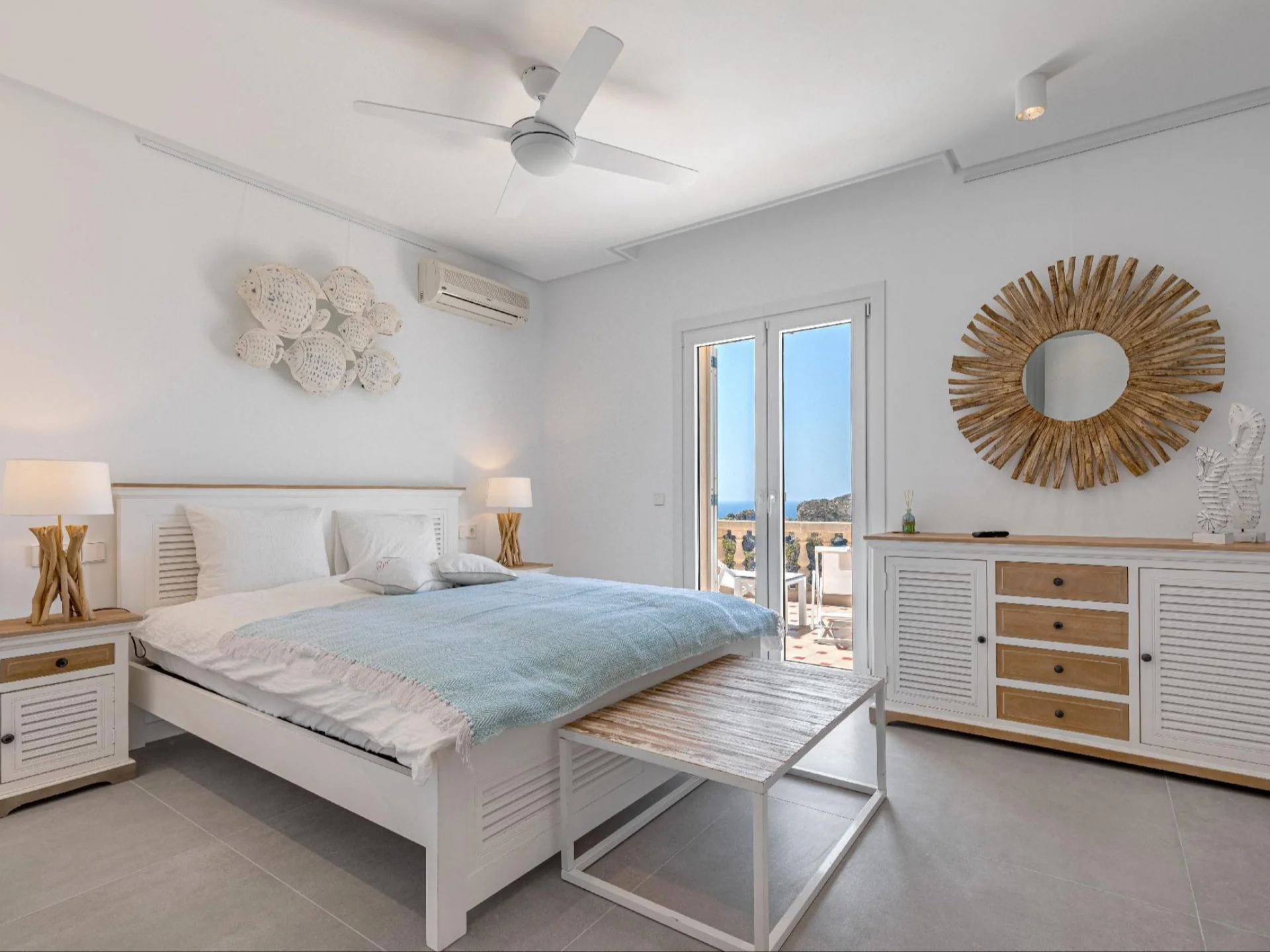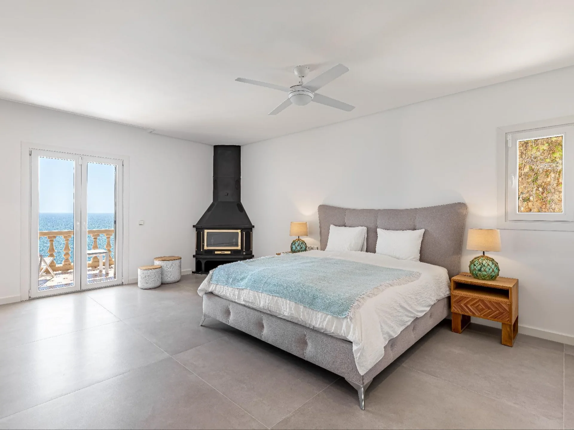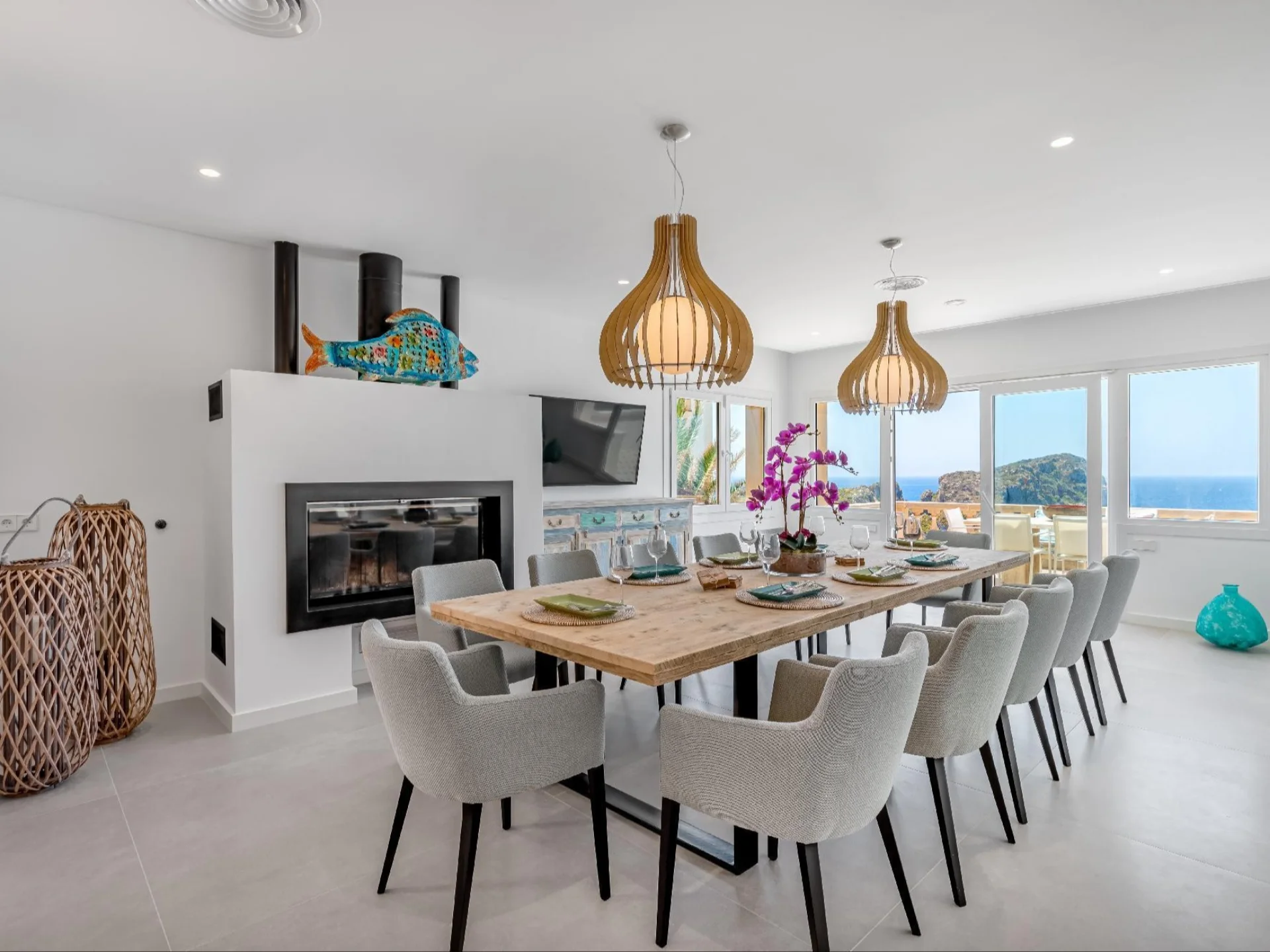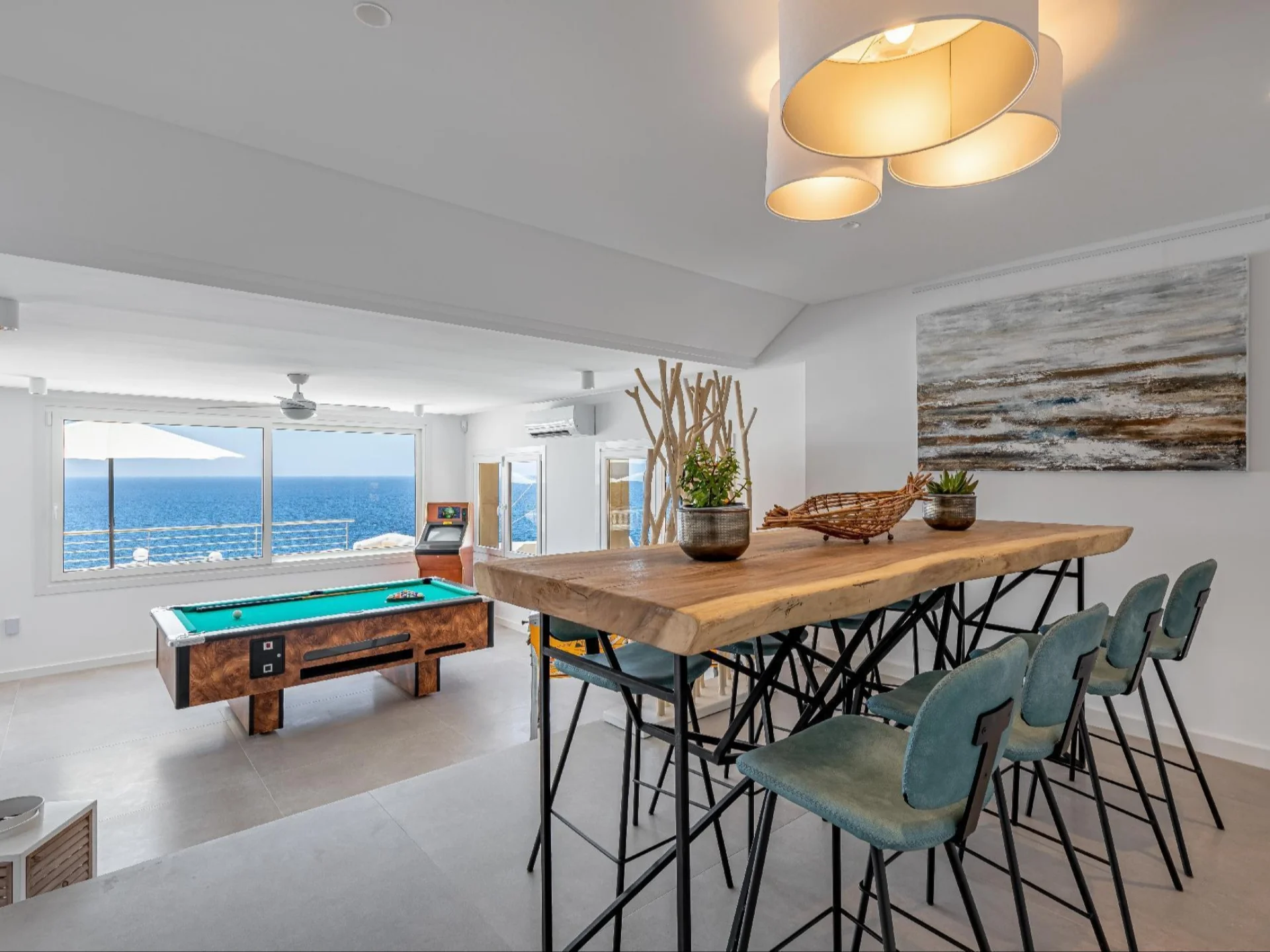 The villa accommodates up to 10 guests across 5 beautifully designed bedrooms, each paired with its own en-suite bathroom. Interiors are finished to the highest standard, featuring a grand open-plan living room, a formal fireplace room, and a fully equipped modern kitchen with sleek cabinetry and premium appliances. A dedicated games room complete with a pool table and bar provides the perfect space for evening entertainment, while floor-to-ceiling windows throughout flood every room with natural light and frame the ever-present sea views.