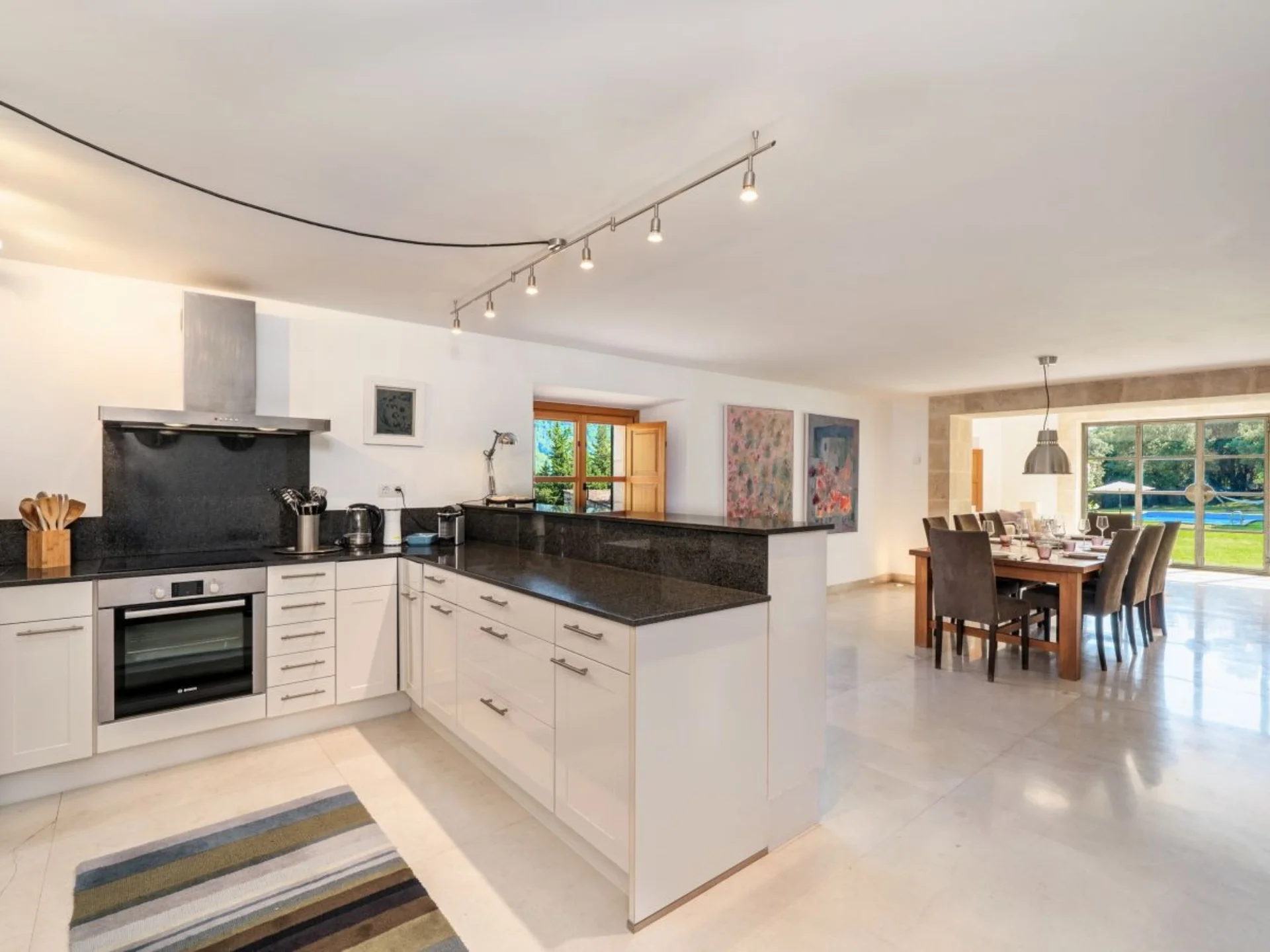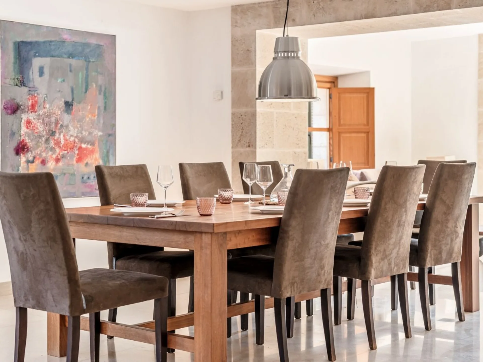 Inside, the villa offers four comfortable bedrooms and a selection of inviting living spaces designed for both relaxation and practicality. The interiors combine traditional Mallorcan charm with modern conveniences, including air conditioning, a fully equipped kitchen, and a bright living area with Smart TV. Each space is thoughtfully arranged to provide comfort and ease throughout your stay.