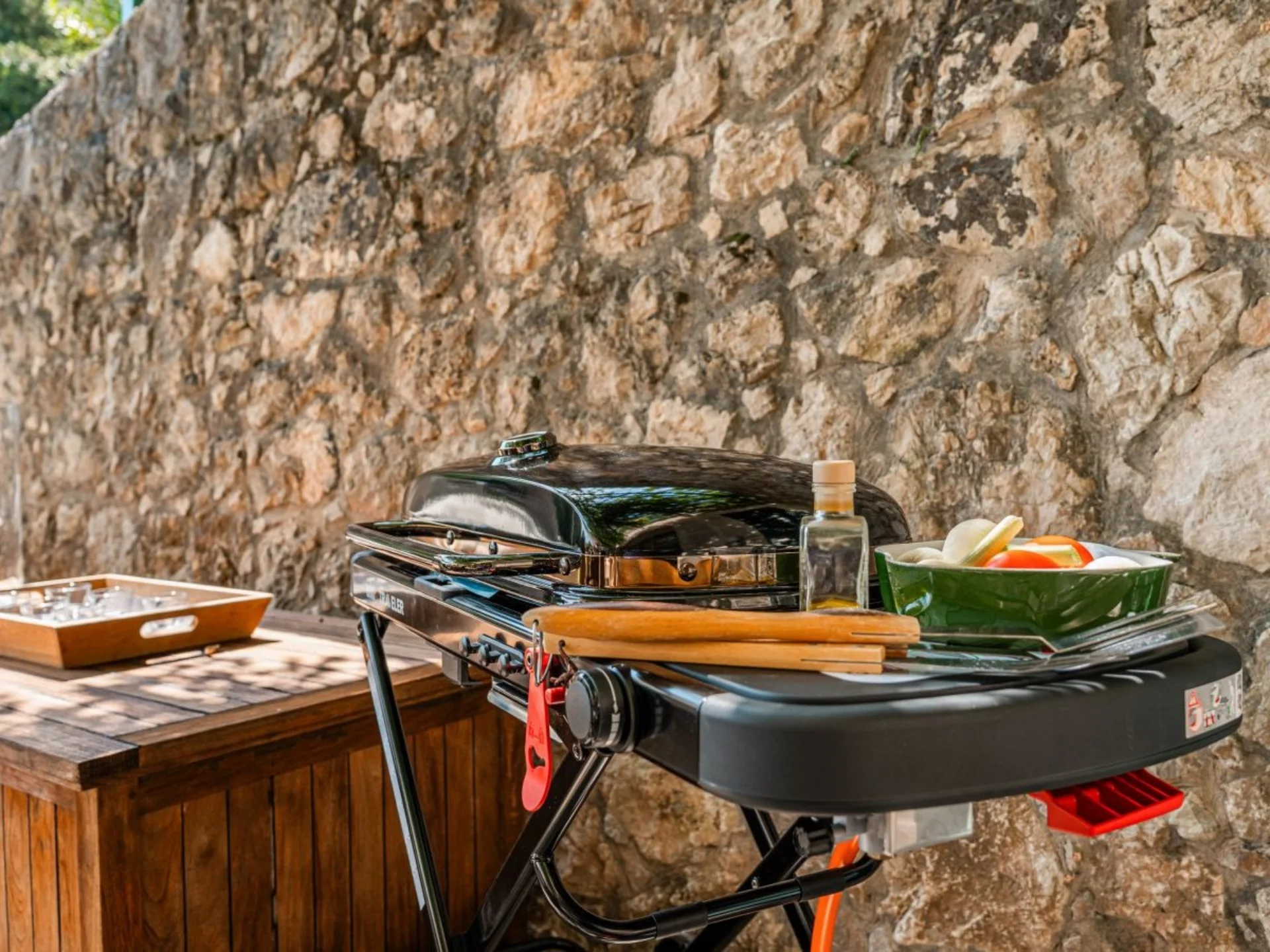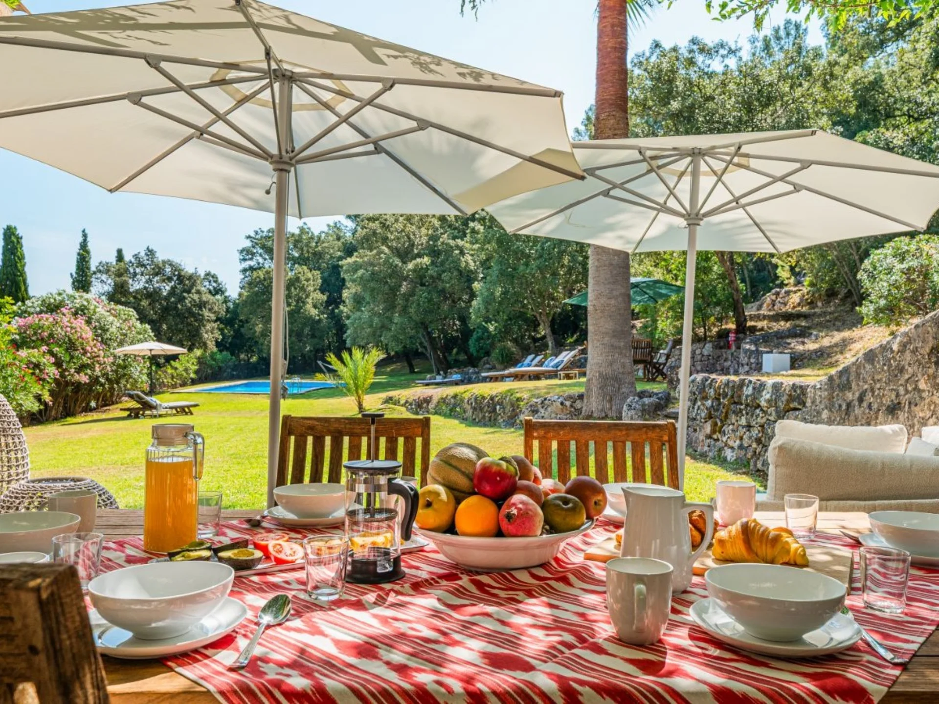 The outdoor spaces are designed for relaxed Mediterranean living. A large private swimming pool sits at the centre of the grounds, framed by expansive lawns and sunbathing areas. Covered terraces and a dedicated outdoor dining space with BBQ provide the perfect setting for long, leisurely meals, while the surrounding landscape creates a serene and secluded atmosphere.