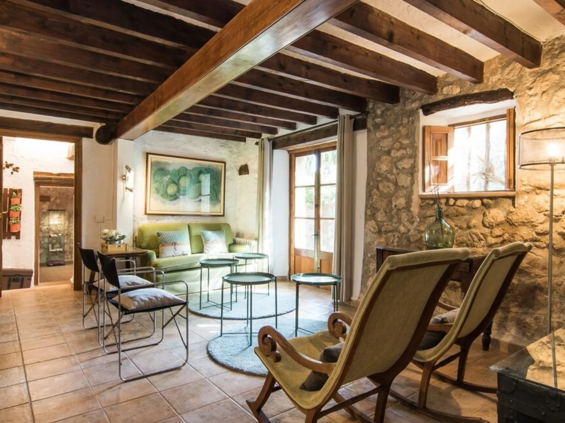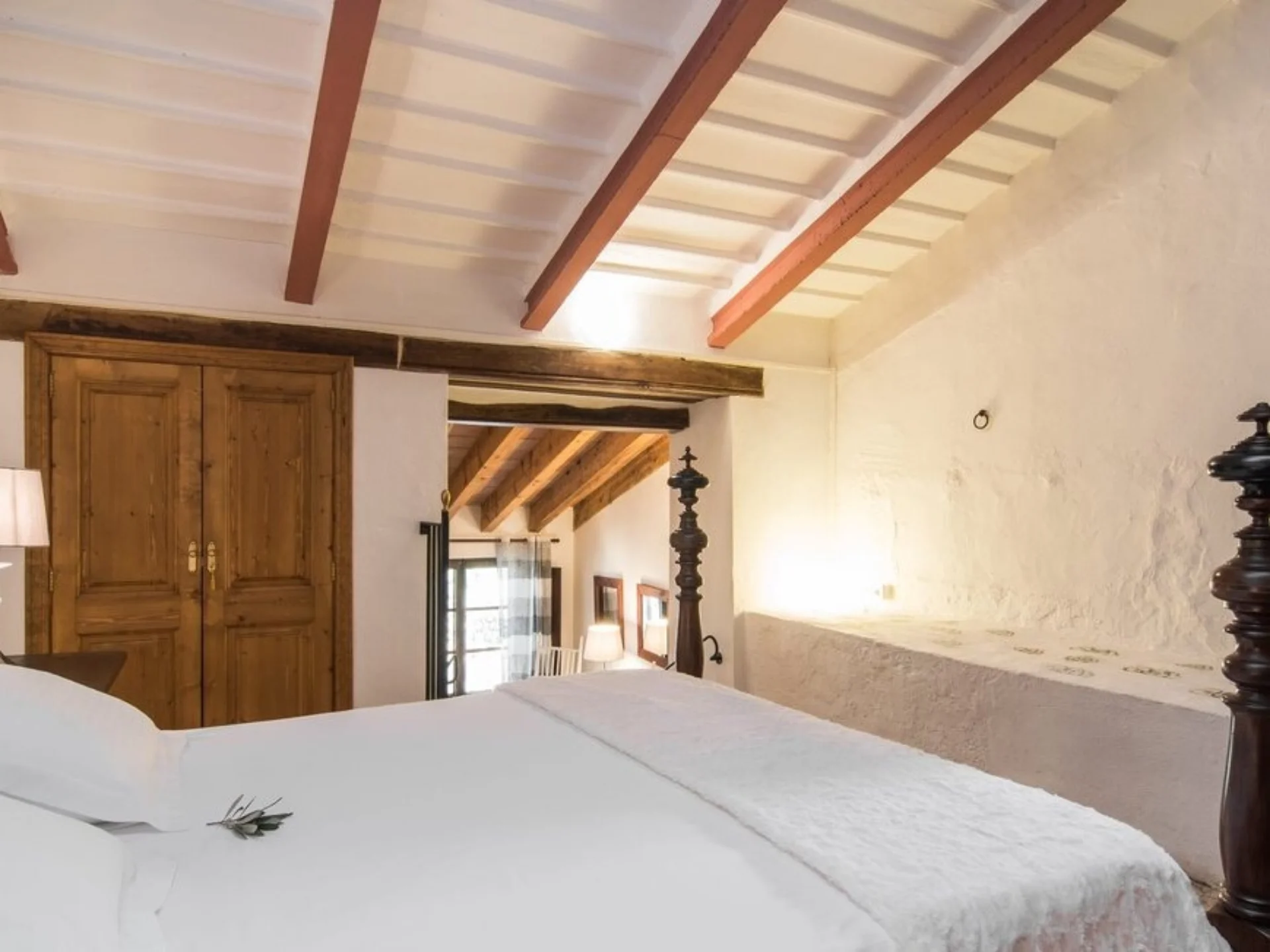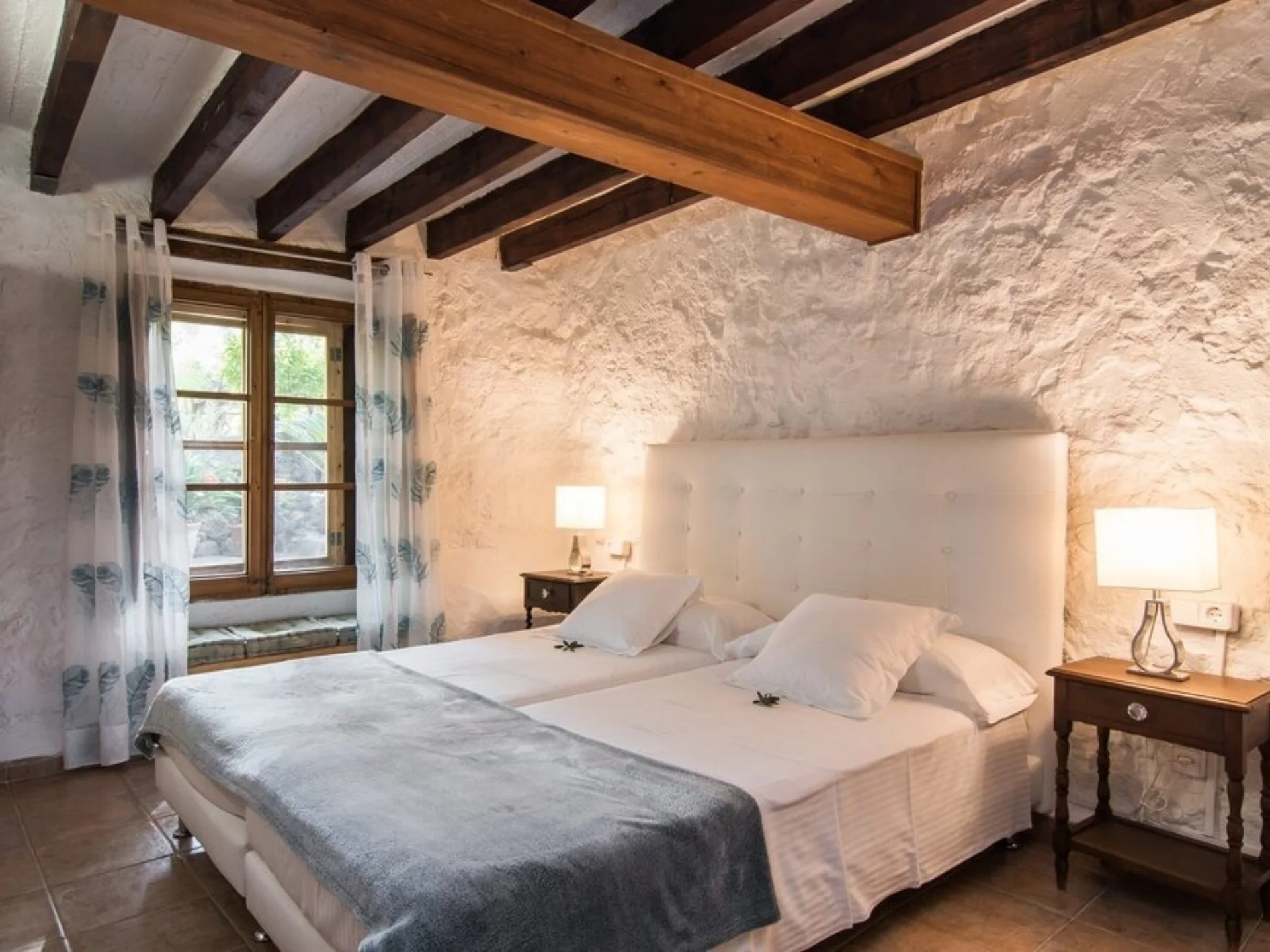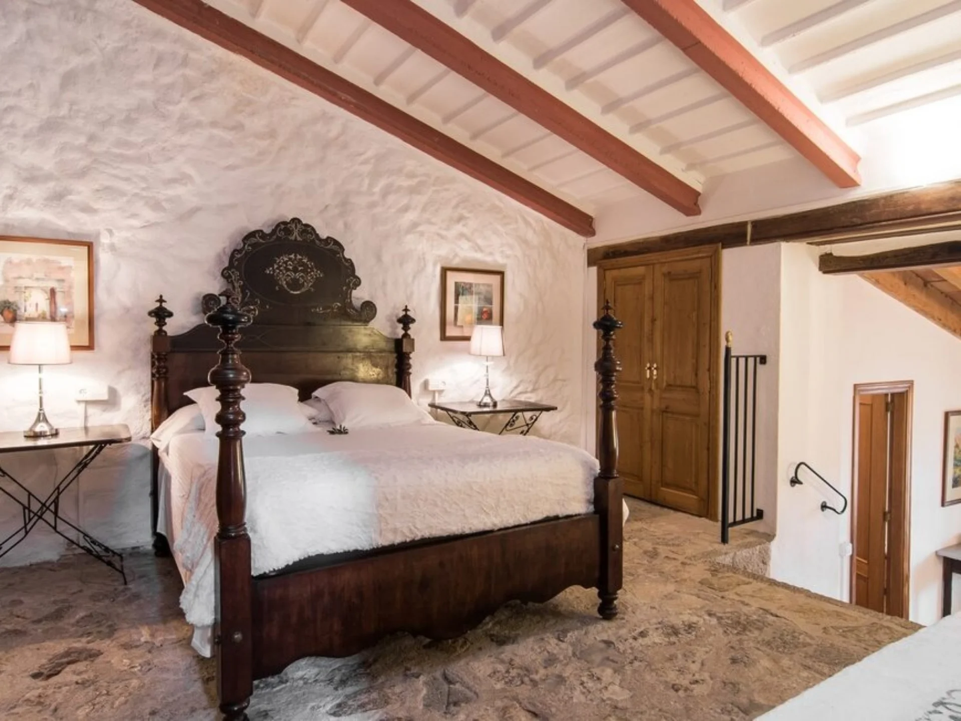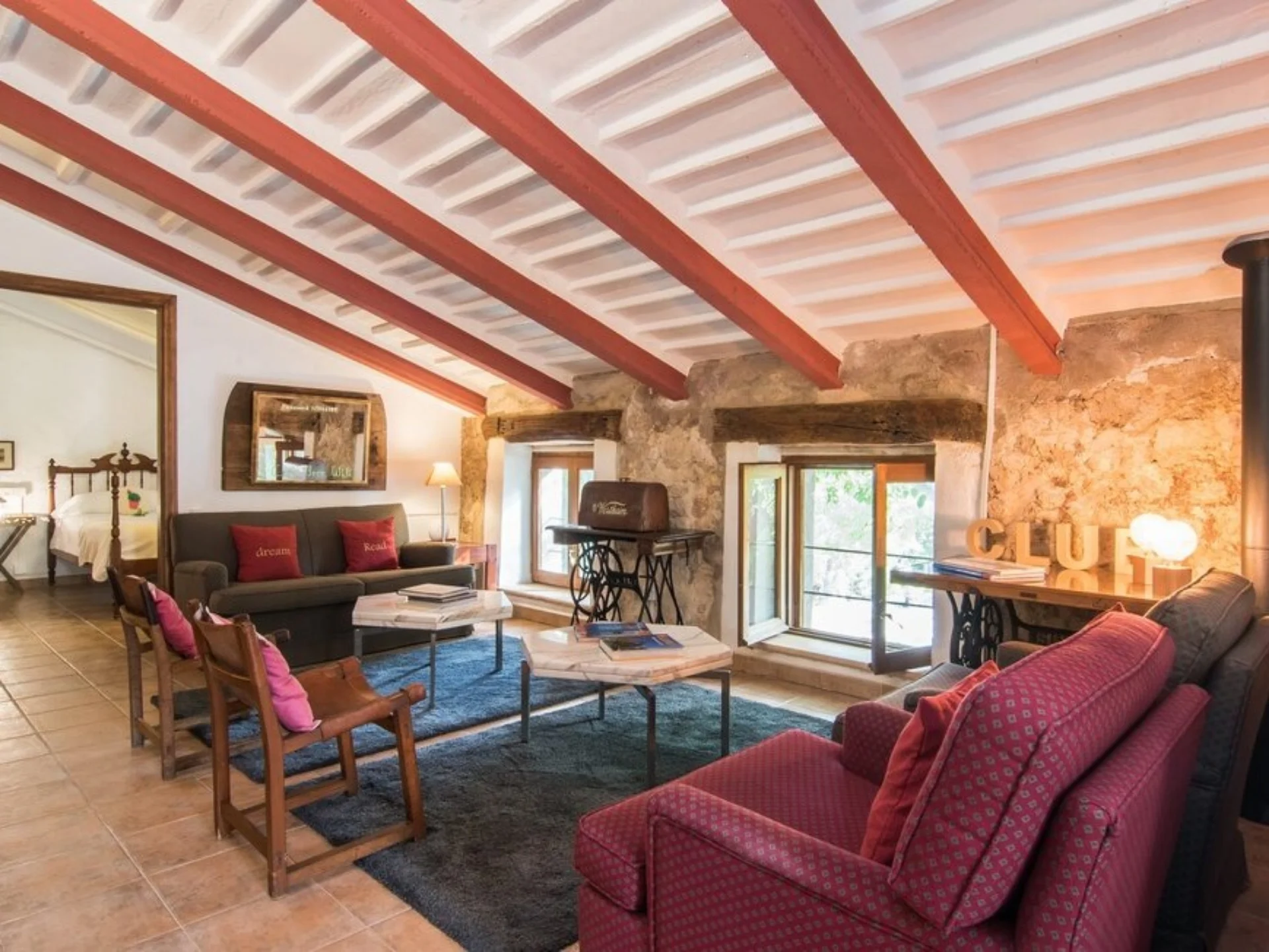 Inside, the finca blends traditional Mallorcan architecture with modern comfort. Original stone walls and historic features have been carefully preserved and complemented by contemporary finishes, resulting in a characterful yet comfortable home. The layout includes two inviting living rooms with fireplaces, a fully equipped kitchen, and seven beautifully appointed bedrooms, each with its own en-suite bathroom. Several bedrooms are arranged on split levels and offer additional seating areas, creating a suite-like feel and enhanced privacy.