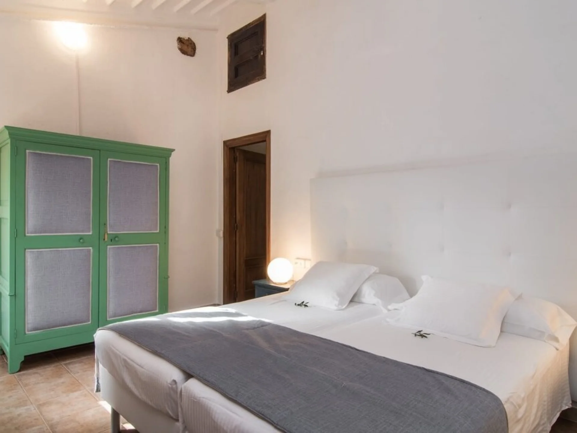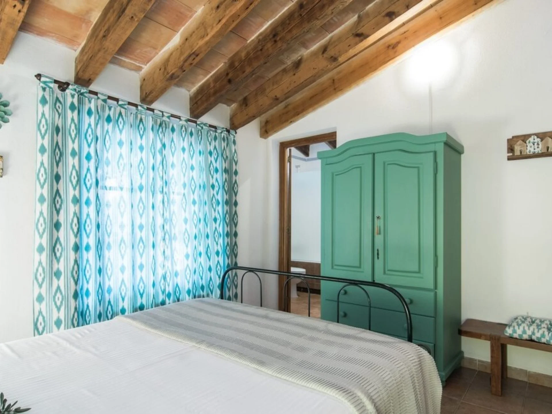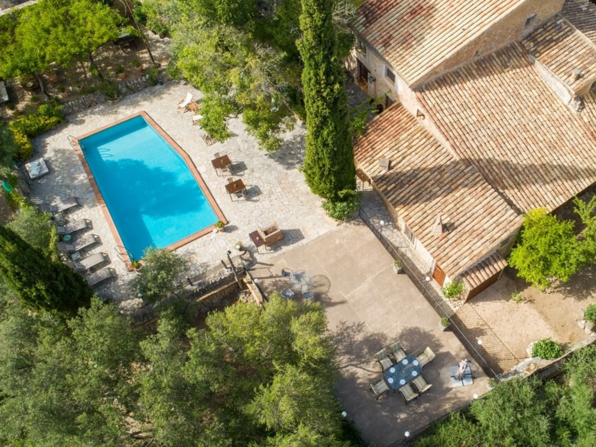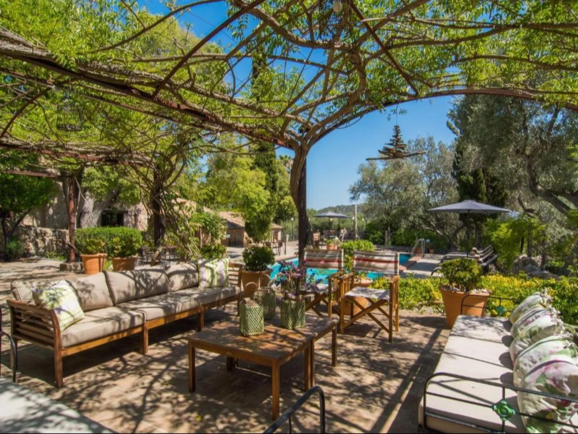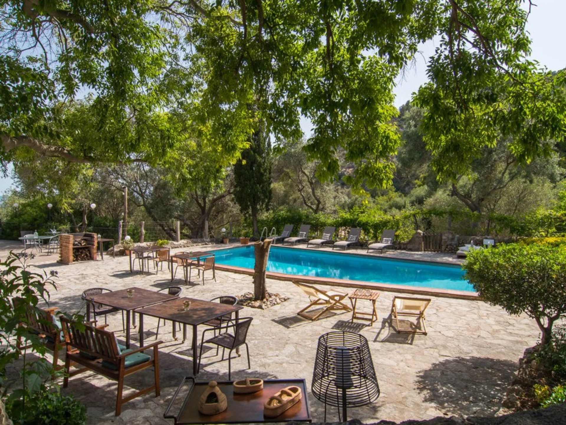 Inside, the finca blends traditional Mallorcan architecture with modern comfort. Original stone walls and historic features have been carefully preserved and complemented by contemporary finishes, resulting in a characterful yet comfortable home. The layout includes two inviting living rooms with fireplaces, a fully equipped kitchen, and seven beautifully appointed bedrooms, each with its own en-suite bathroom. Several bedrooms are arranged on split levels and offer additional seating areas, creating a suite-like feel and enhanced privacy.