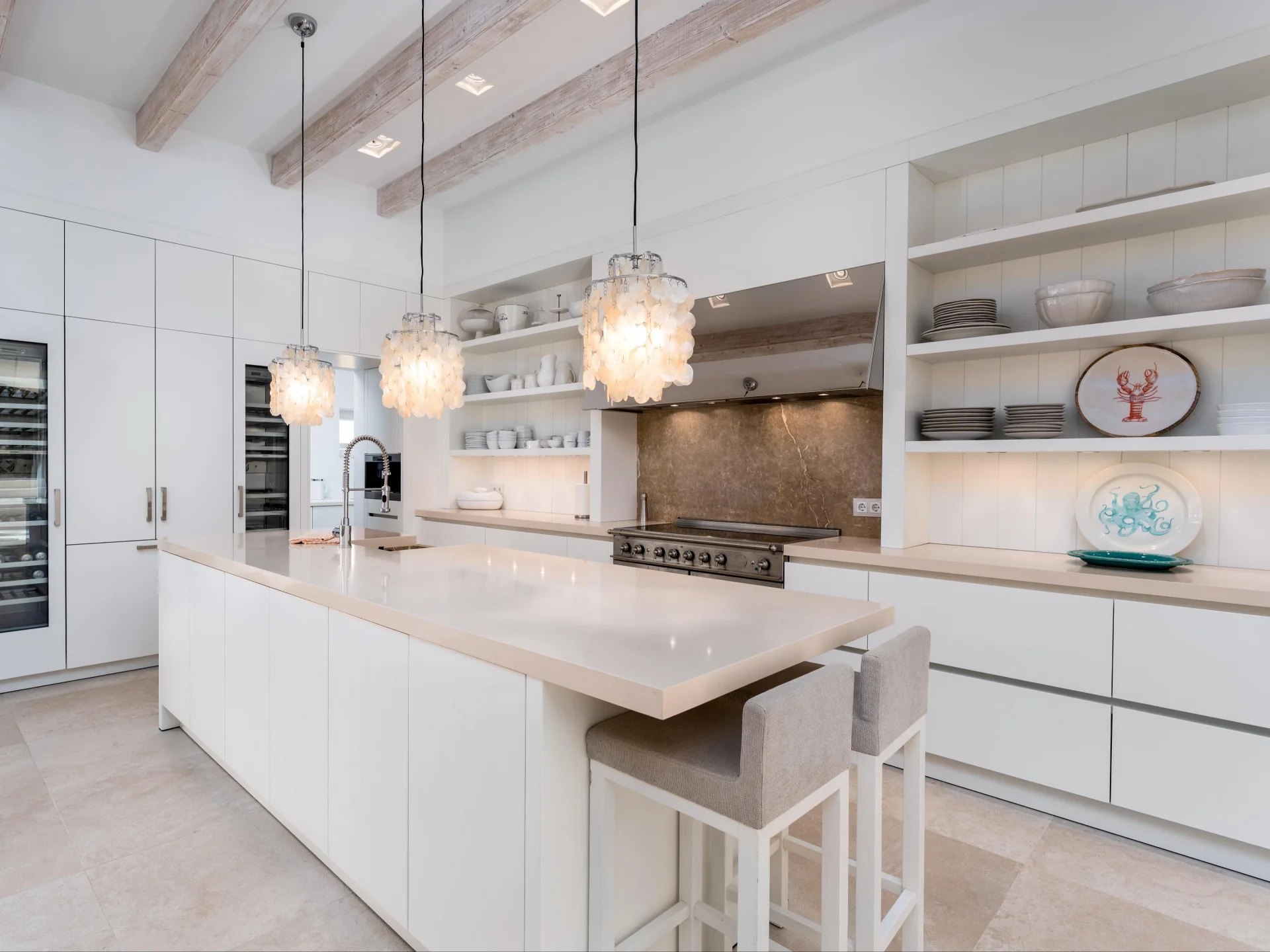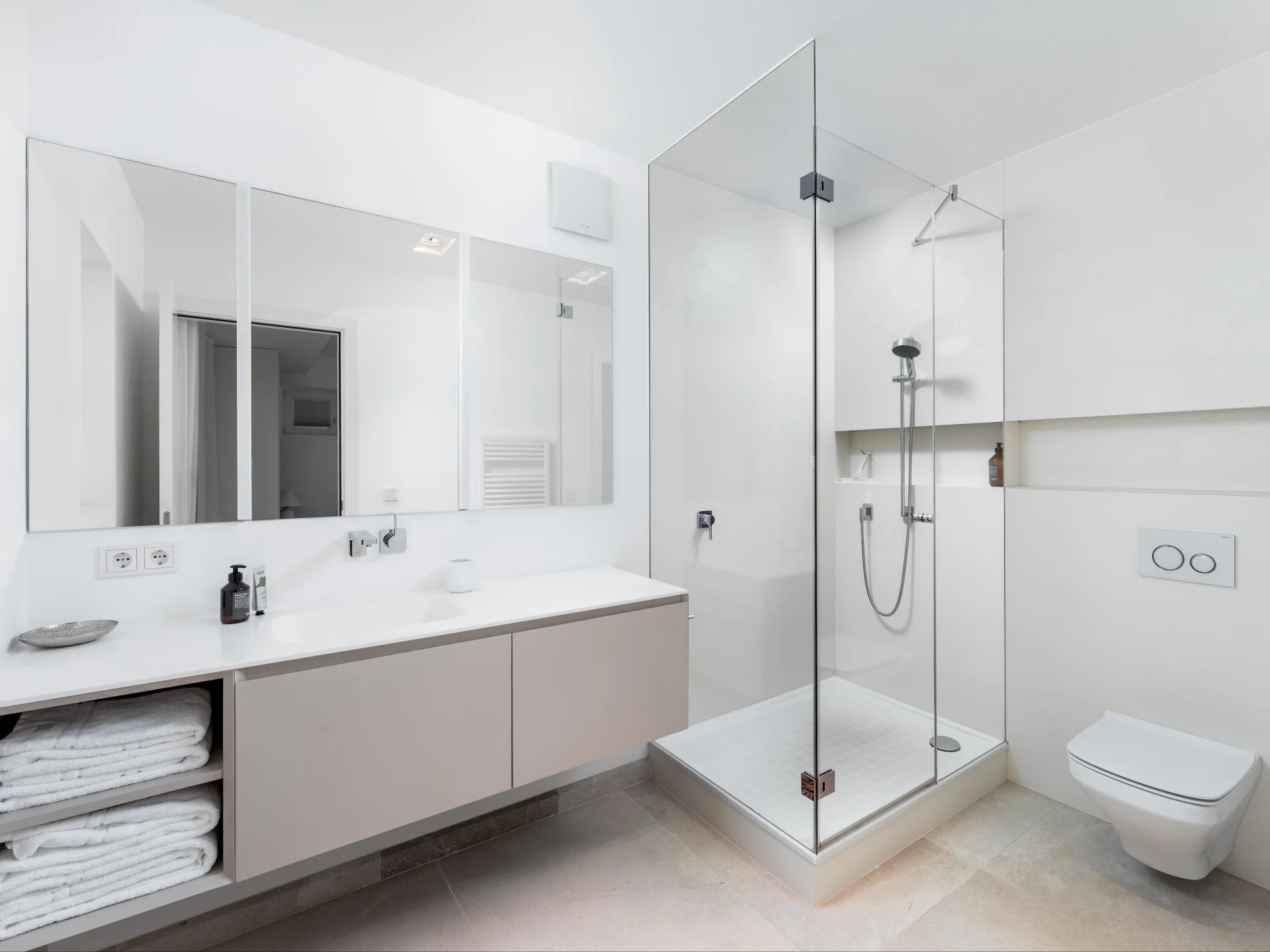 The open-plan living area embodies understated elegance, with sleek furnishings, floor-to-ceiling windows, and direct terrace access that ensures uninterrupted sea views from every angle. A fully equipped designer kitchen with high-end appliances flows seamlessly into the dining area, creating the perfect space for relaxed gatherings. The villa’s minimalist aesthetic—defined by natural tones, clean lines, and soft textures—evokes calm throughout, while state-of-the-art amenities ensure absolute comfort.