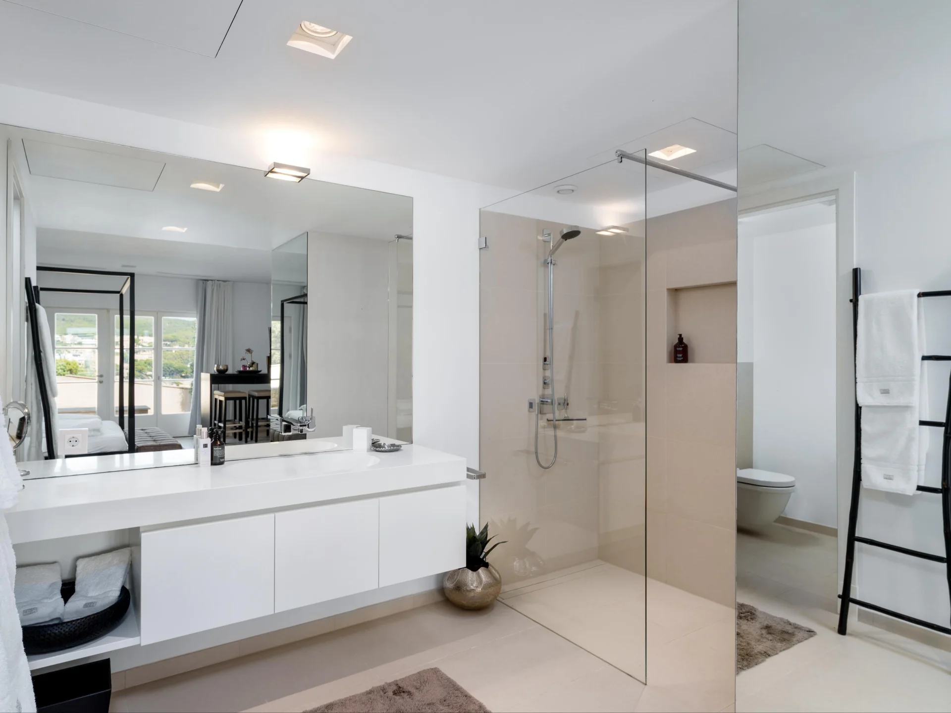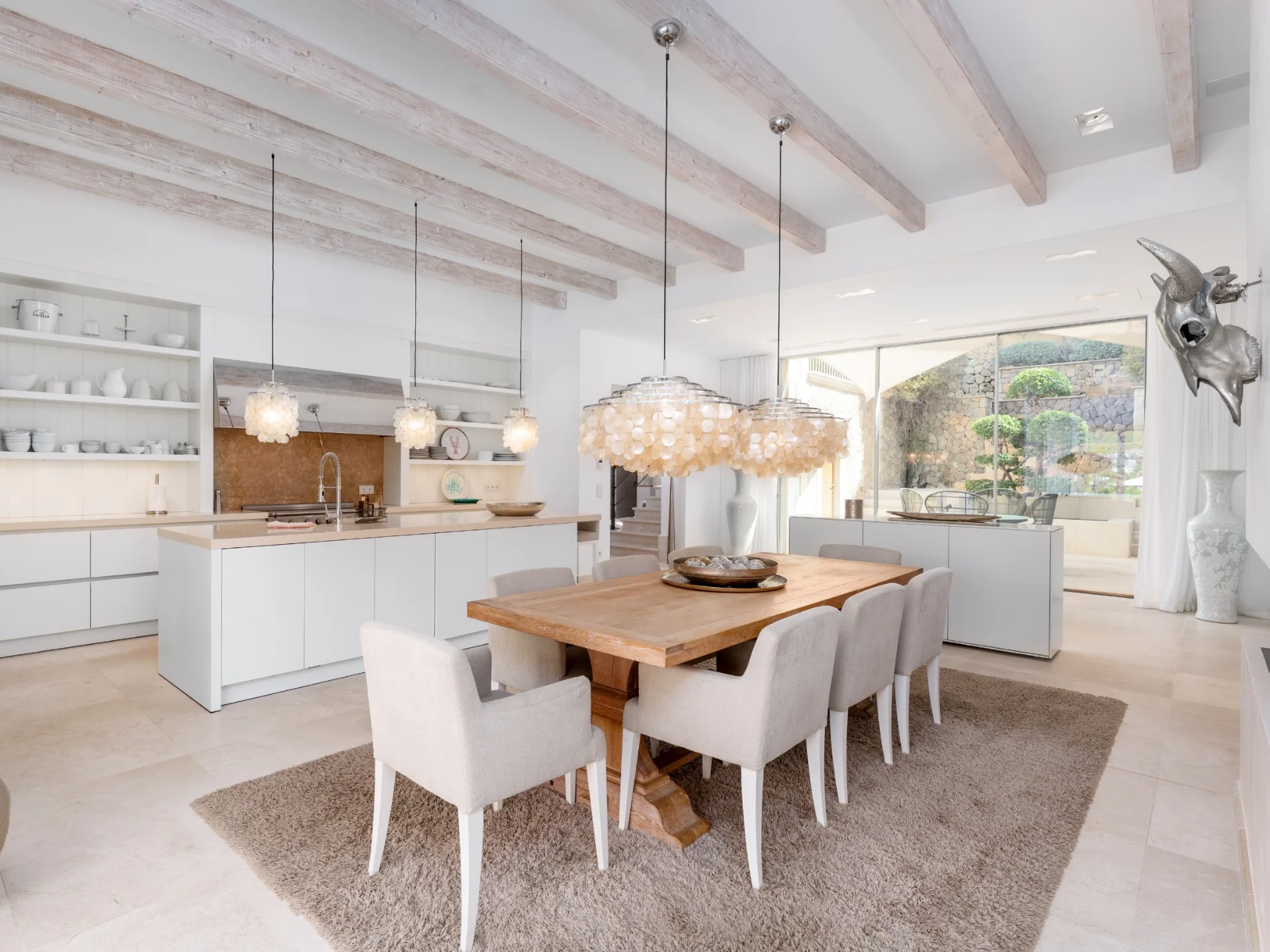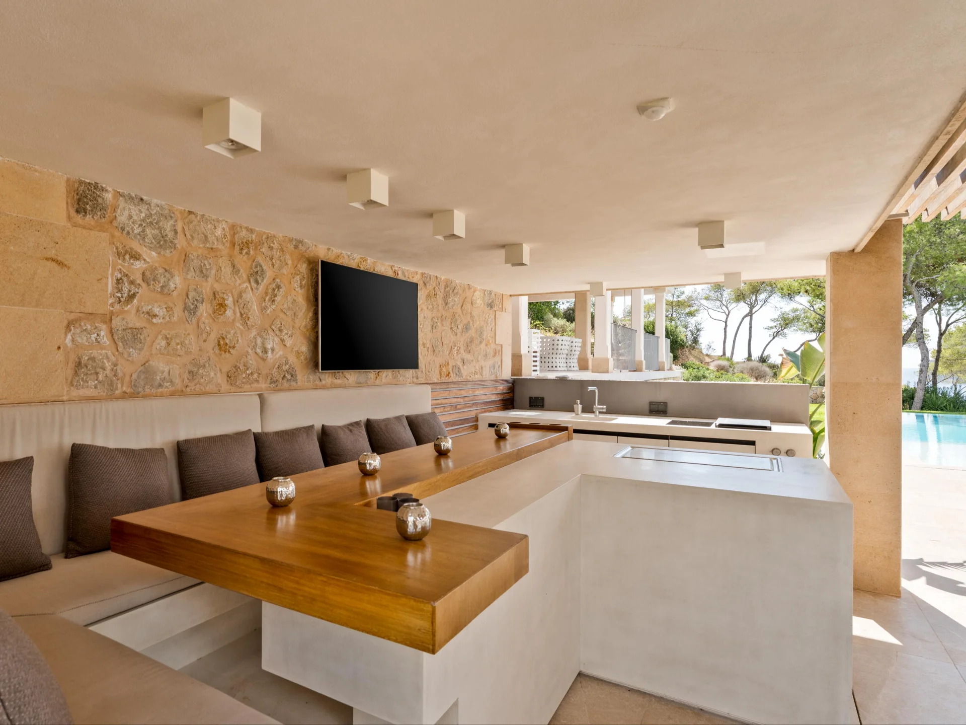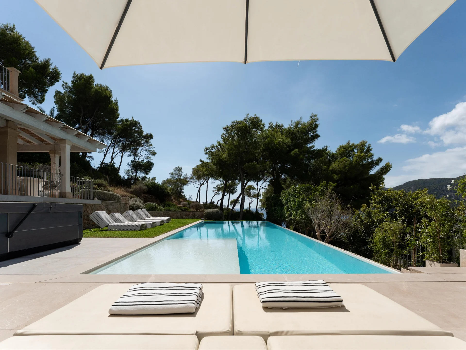 Outside, the infinity pool appears to merge effortlessly with the horizon, surrounded by sun loungers and a tranquil chill-out area. A shaded terrace provides the ideal setting for alfresco dining, while the landscaped Mediterranean gardens offer total privacy and breathtaking sunsets over the glistening sea.