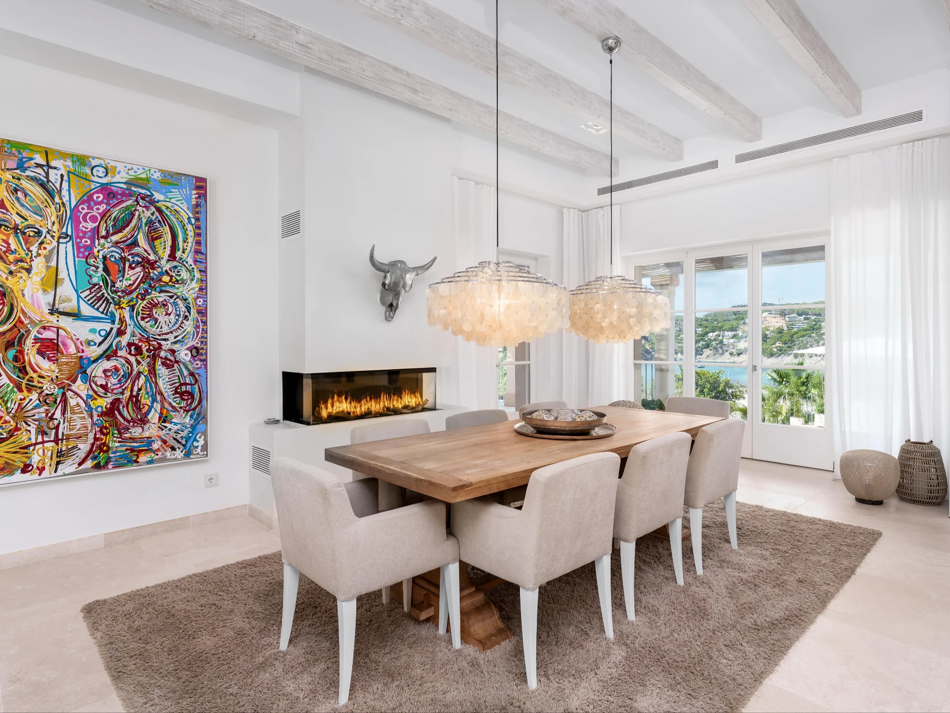 The living areas include a spacious open-plan lounge with designer furnishings and a fireplace, a modern kitchen equipped with top-tier appliances, and an indoor dining area with panoramic views. Floor-to-ceiling glass doors connect the interiors with expansive outdoor spaces, creating a harmonious flow between indoor comfort and open-air living.