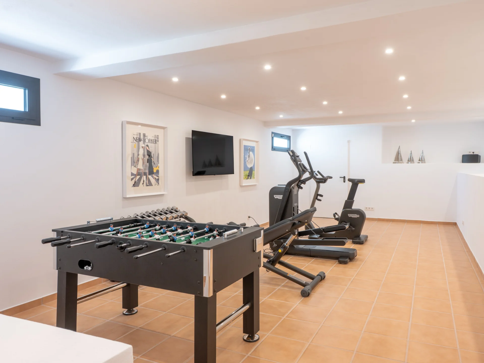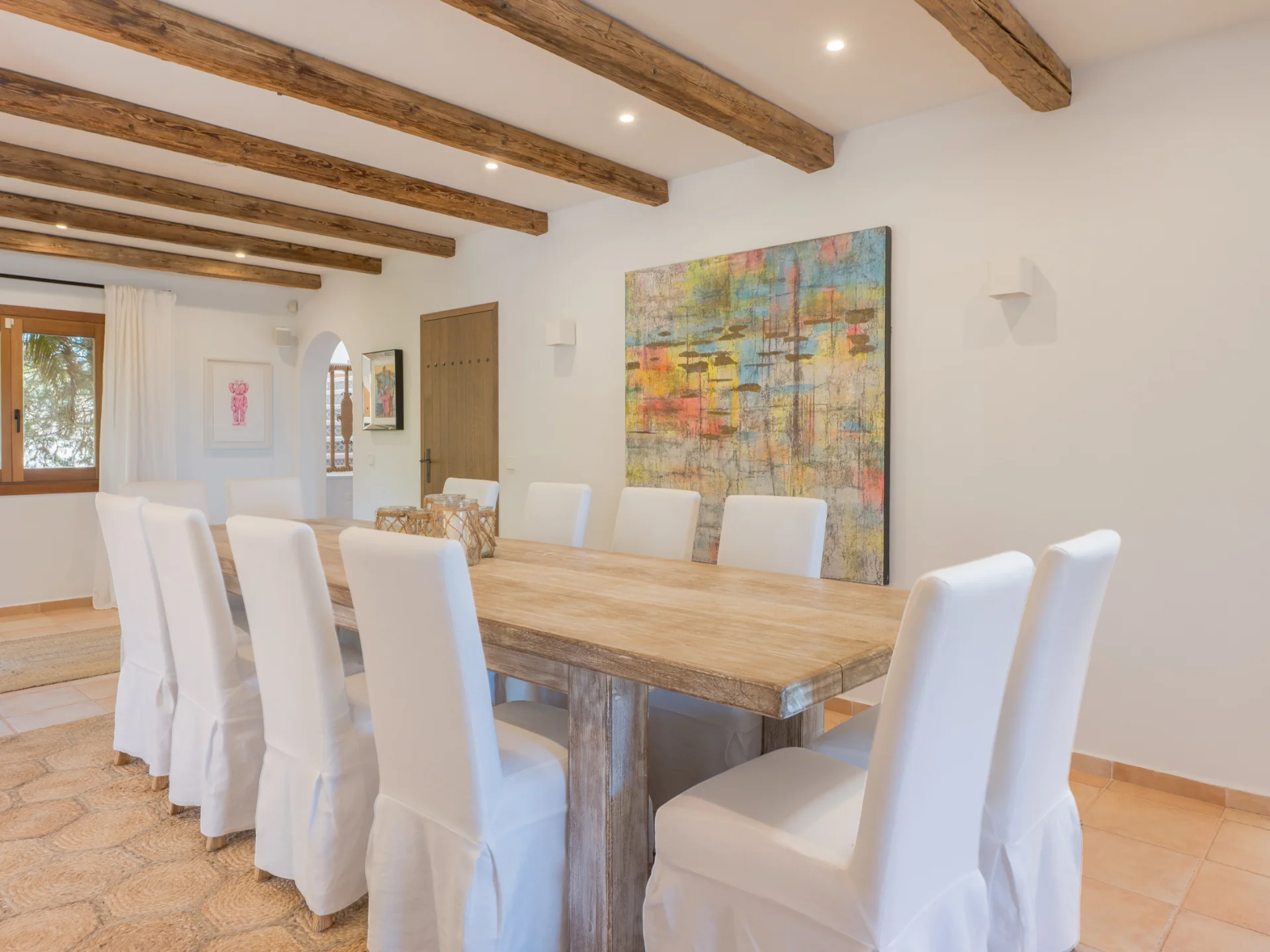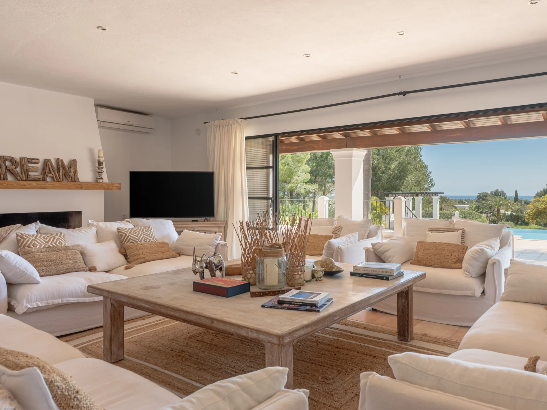 Generous terraces provide the perfect setting for relaxation, whether basking in the sun or enjoying al fresco dining. From the upper terrace, guests can take in enchanting sea views, while the large swimming pool invites leisurely afternoons under the Ibizan sky.