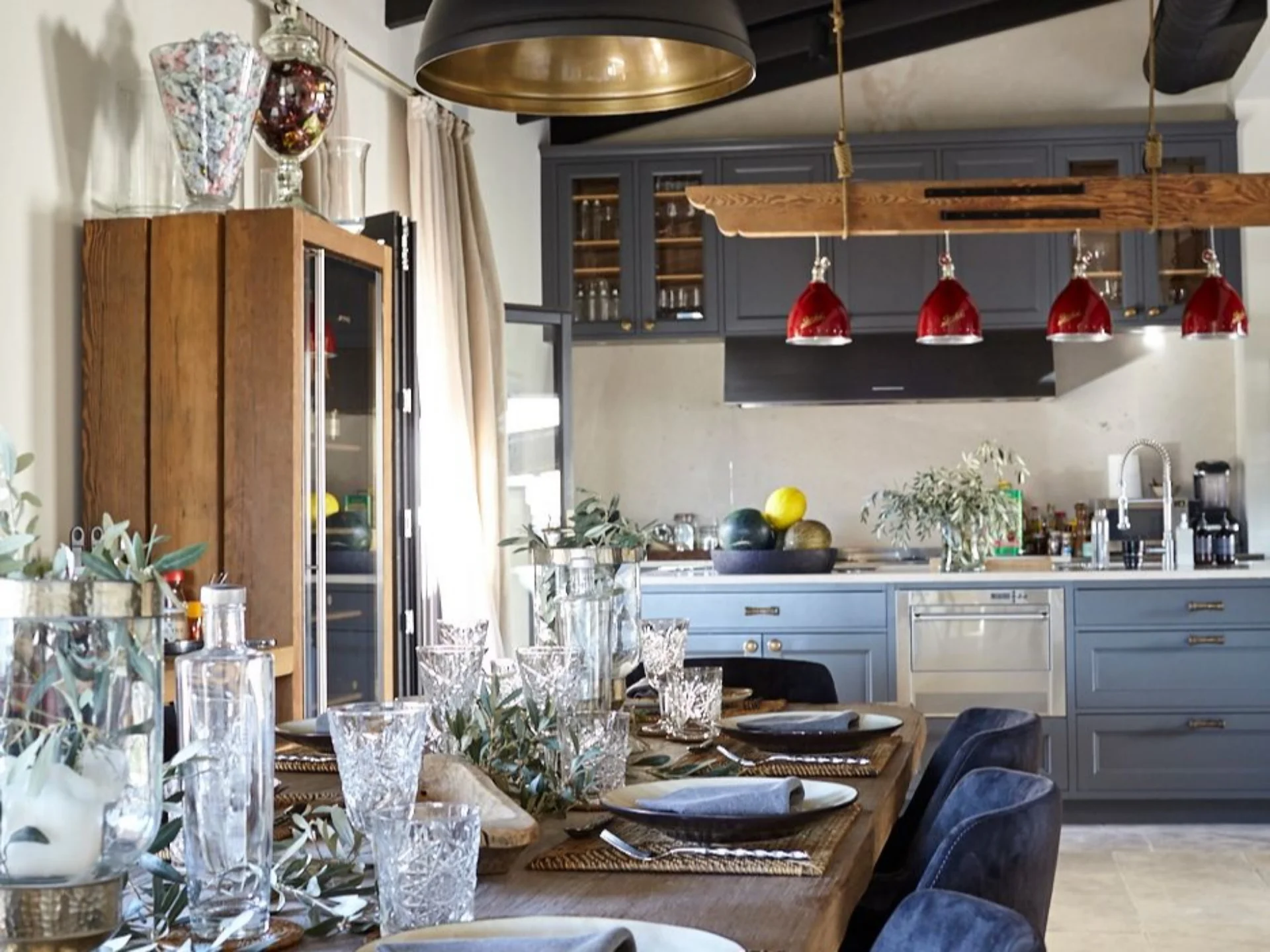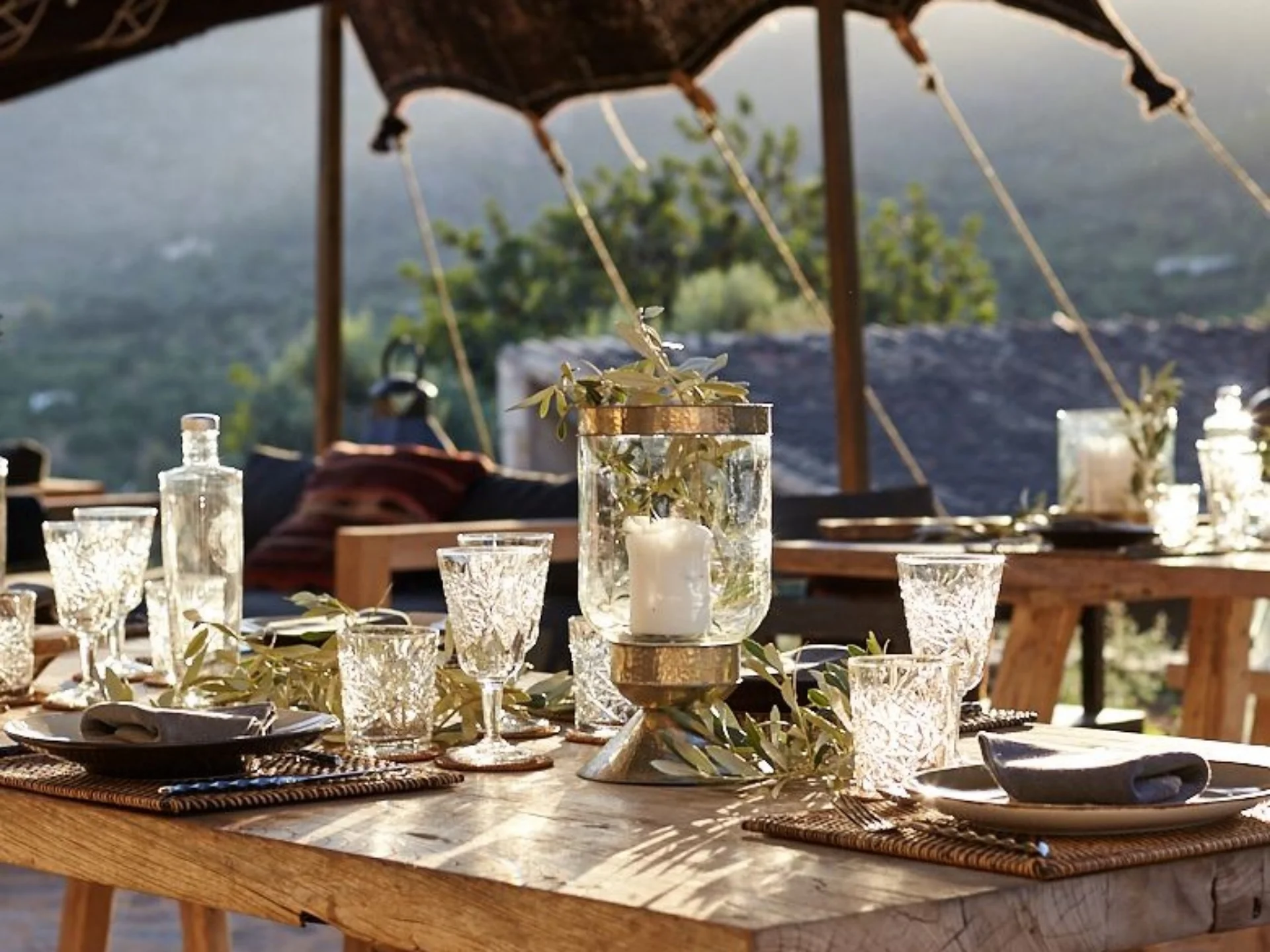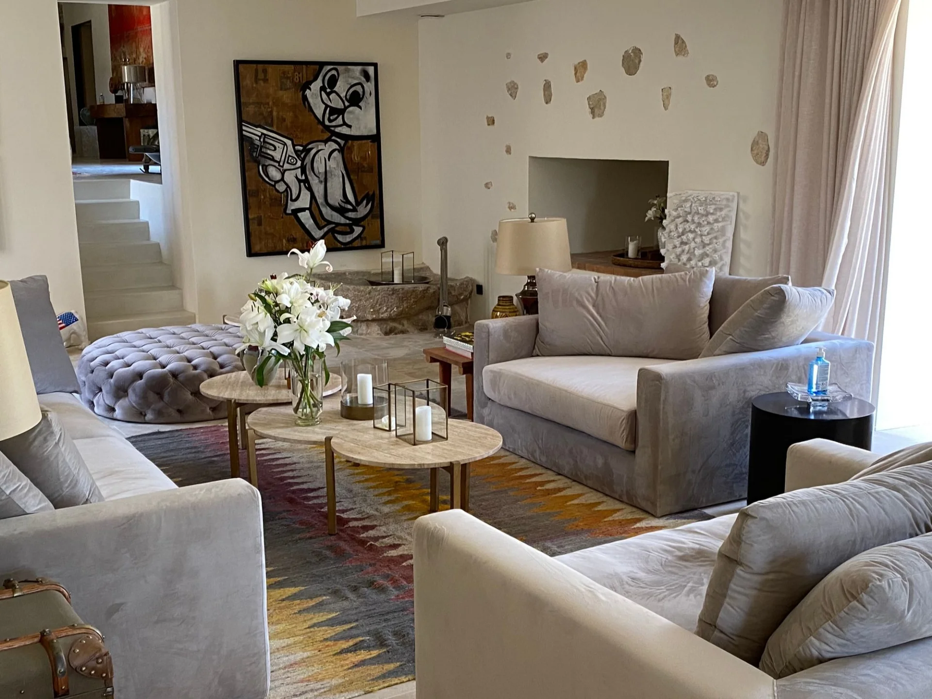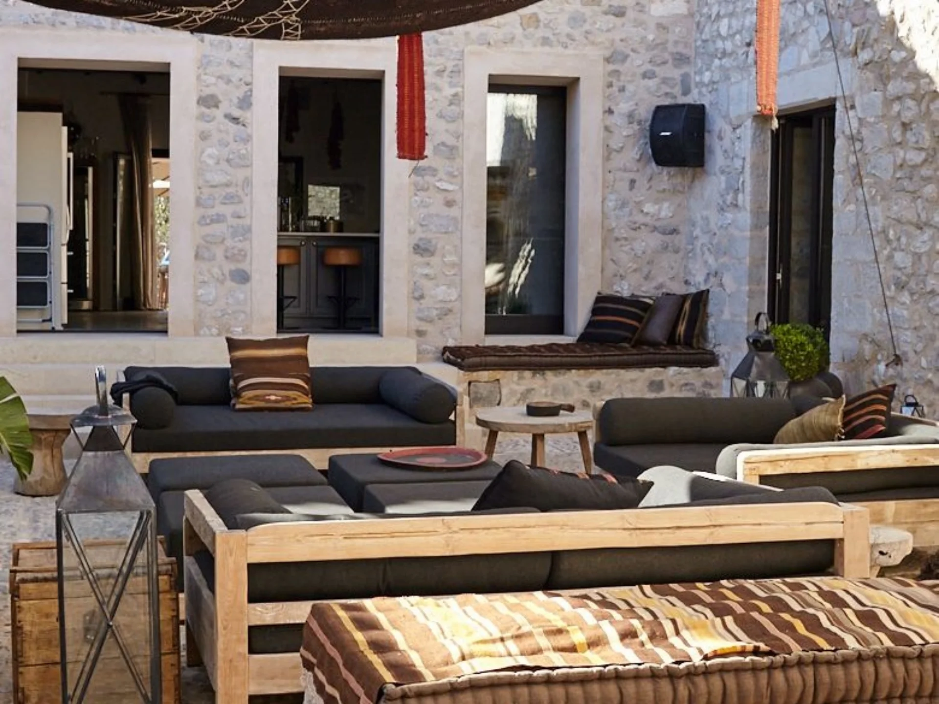 The estate features 10 beautifully appointed ensuite bedrooms, each designed with Hypnos cashmere beds, Egyptian cotton linens, and high-end amenities by Grown Alchemist and Ortigia. Guests can unwind across a variety of elegant indoor and outdoor living spaces, including a cinema, spa, gym, yoga areas, and multiple terraces ideal for dining or relaxation. The large pool area, surrounded by sunbeds and Moroccan Berber tents, offers an idyllic setting for long afternoons under the Mediterranean sun.