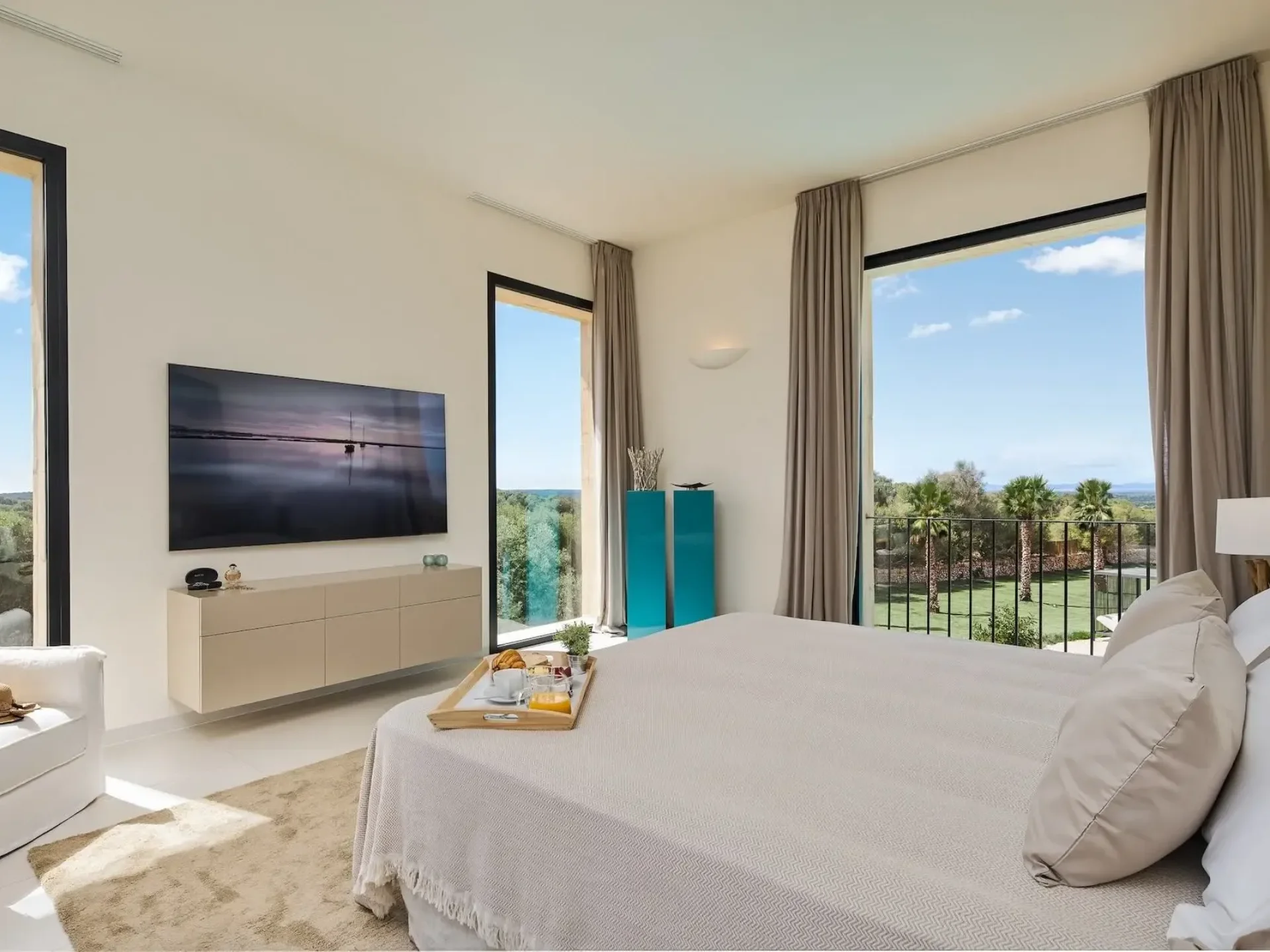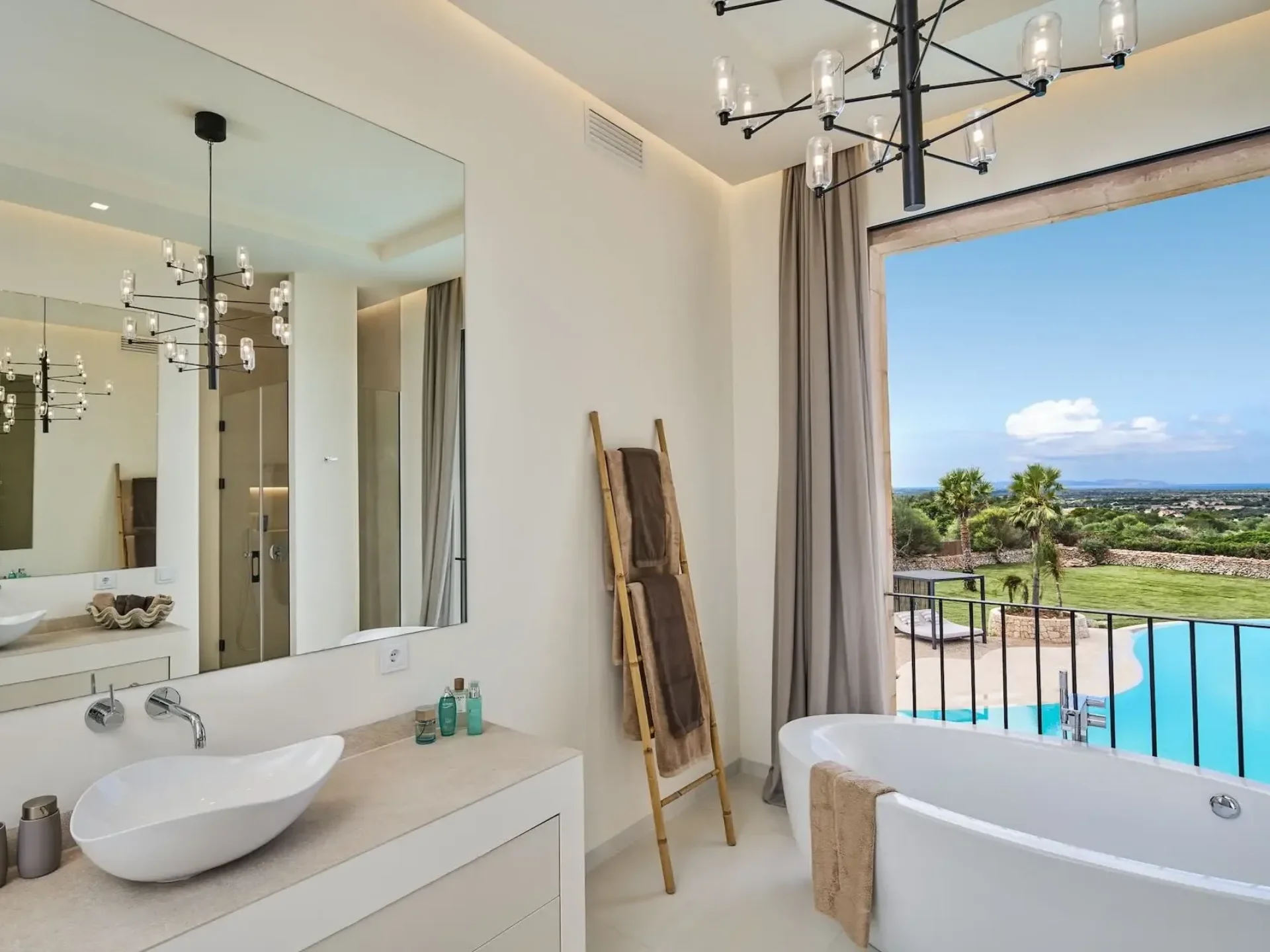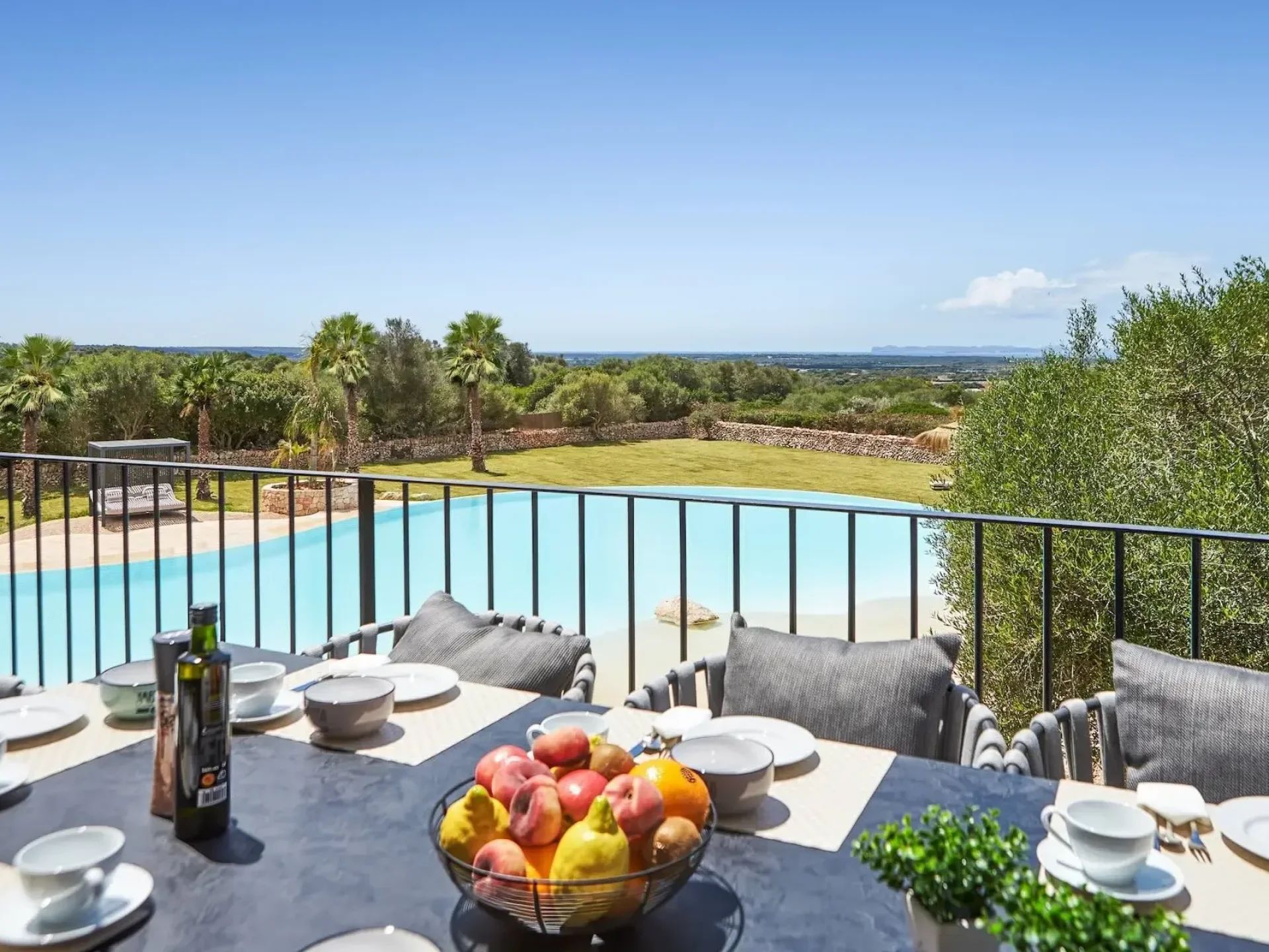 The ground floor features four spacious ensuite bedrooms, each with Smart TV and direct access to the pool terrace, offering exceptional privacy and comfort. Ascend the grand marble staircase to discover a high-ceilinged upper level with a fully equipped designer kitchen and dining terrace for up to ten guests, showcasing panoramic views over the pool and across to the island of Cabrera. The luxurious master suite includes a king-size bed, walk-in wardrobe, and an elegant bathroom complete with a rain shower and freestanding bathtub.