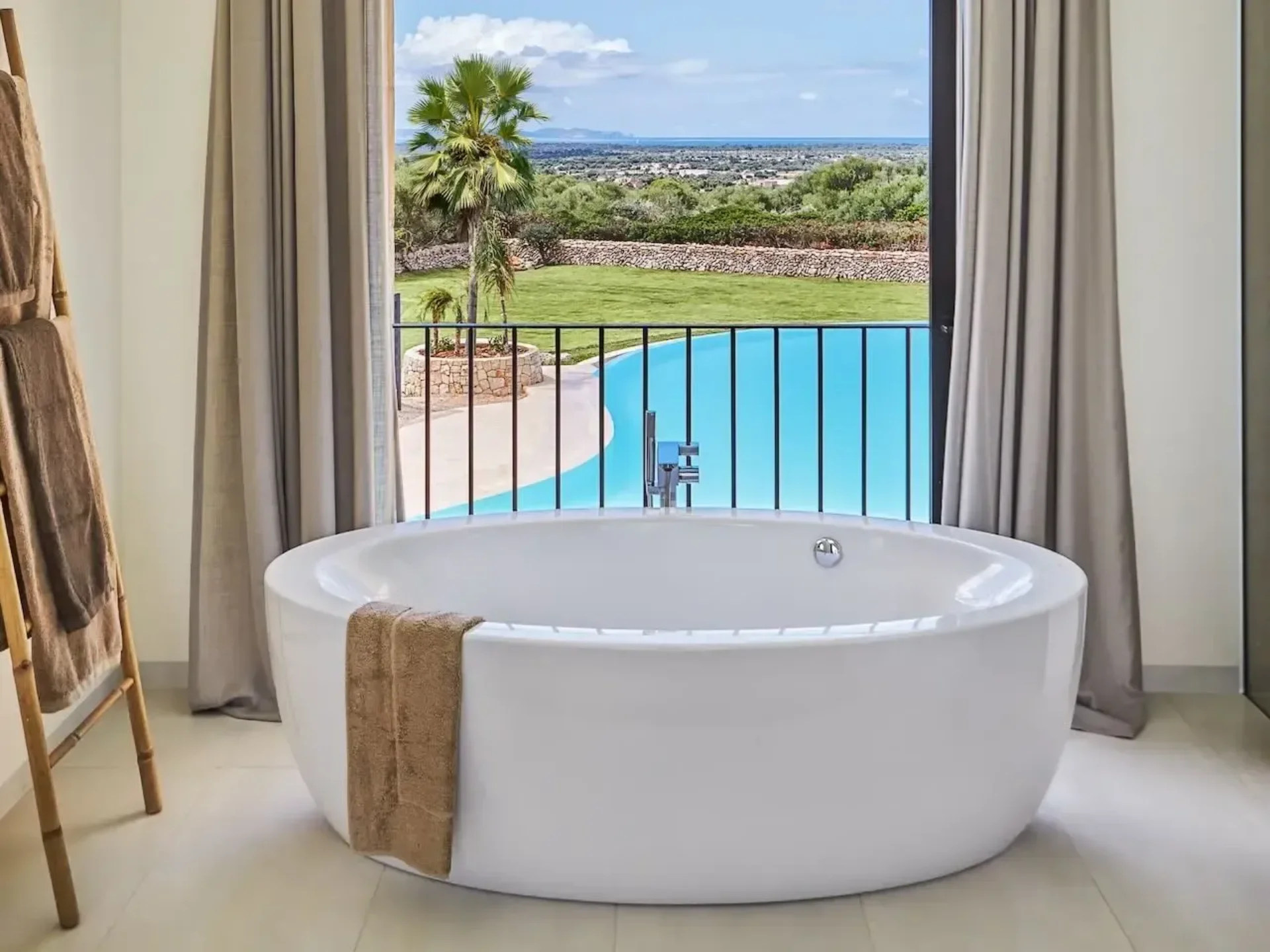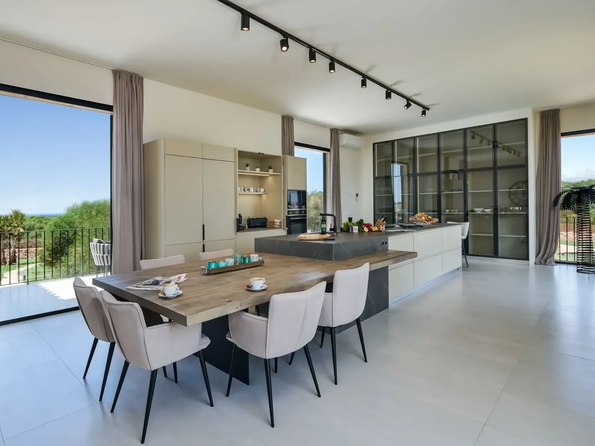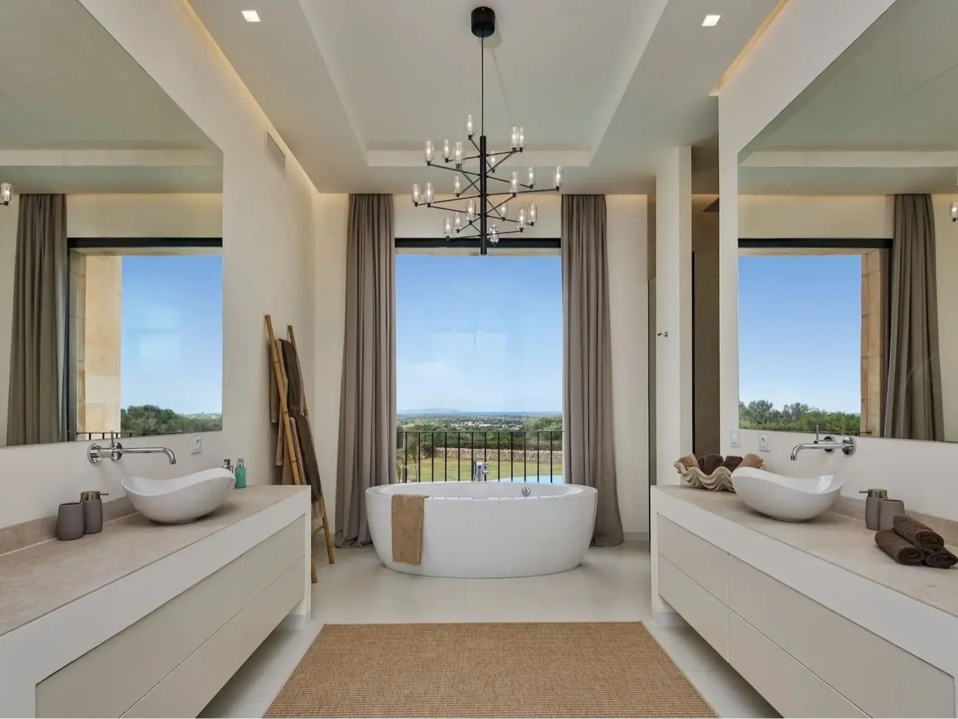 The ground floor features four spacious ensuite bedrooms, each with Smart TV and direct access to the pool terrace, offering exceptional privacy and comfort. Ascend the grand marble staircase to discover a high-ceilinged upper level with a fully equipped designer kitchen and dining terrace for up to ten guests, showcasing panoramic views over the pool and across to the island of Cabrera. The luxurious master suite includes a king-size bed, walk-in wardrobe, and an elegant bathroom complete with a rain shower and freestanding bathtub.