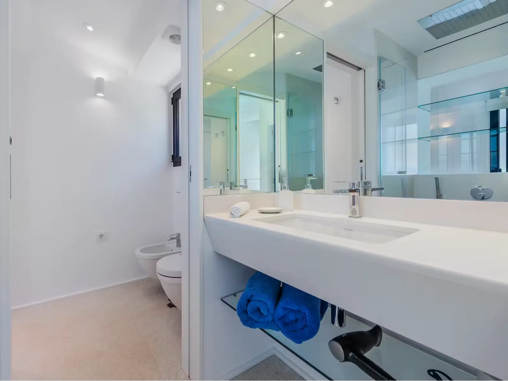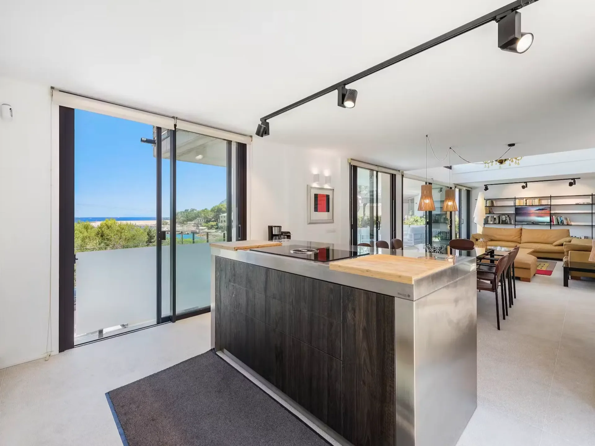 Inside, every bedroom features stunning sea views, and the open-plan living area seamlessly connects through floor-to-ceiling windows to the pool terrace. With three levels of outdoor terraces, there’s a perfect spot for everyone. The lower floor offers a spacious grassy area ideal for children, while the central terrace boasts an inviting infinity pool, shaded dining area, and sun loungers. For unforgettable sunsets, the rooftop terrace features a barbecue area.